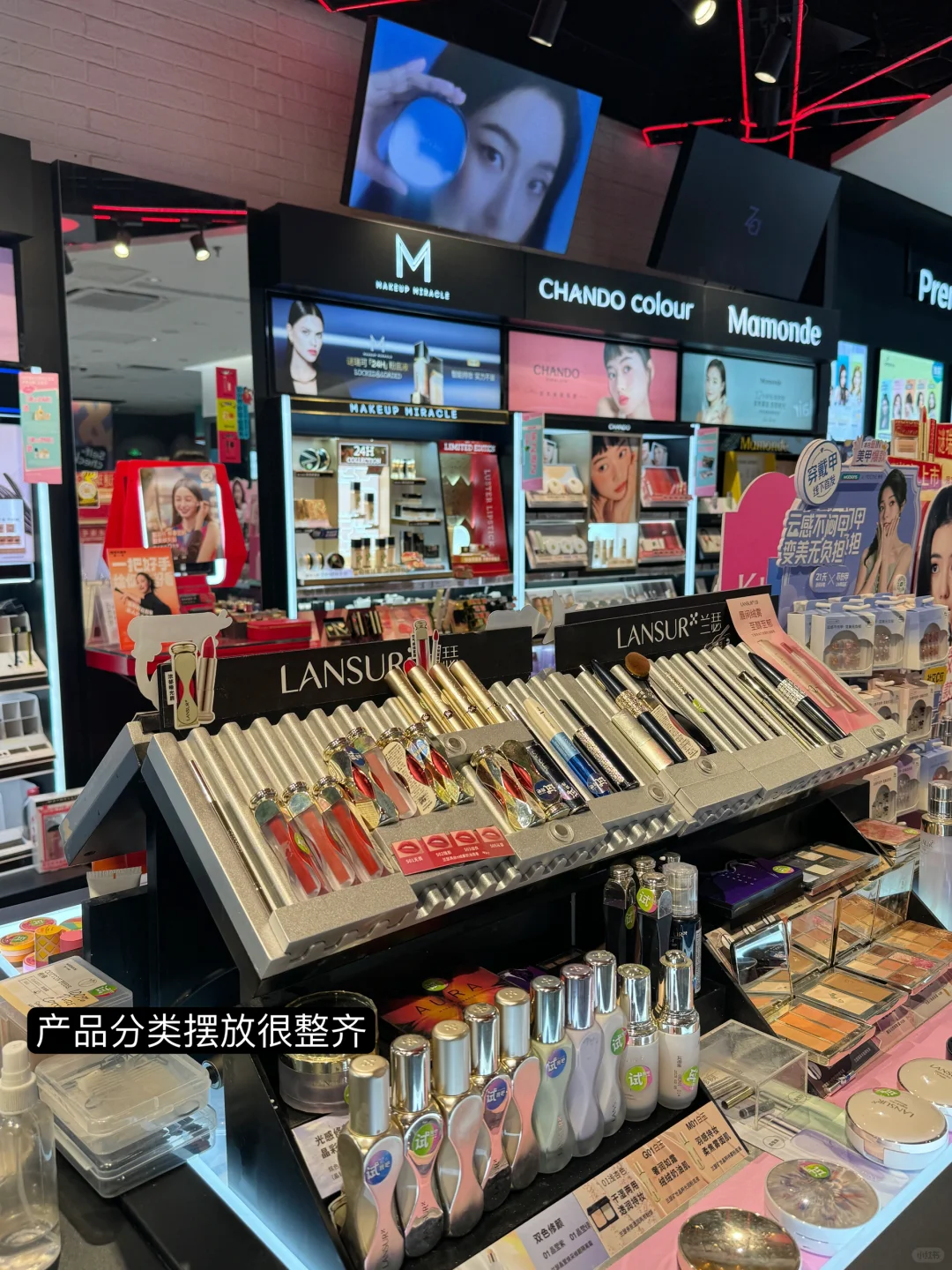 整体看着干净整洁,而且各个区域的分布也很合理,彩妆区和日护区是分开的,找起产品来非常方便,看着指示卡就能轻松找到,彩妆区的面积很大,而且彩妆品牌的种类很多