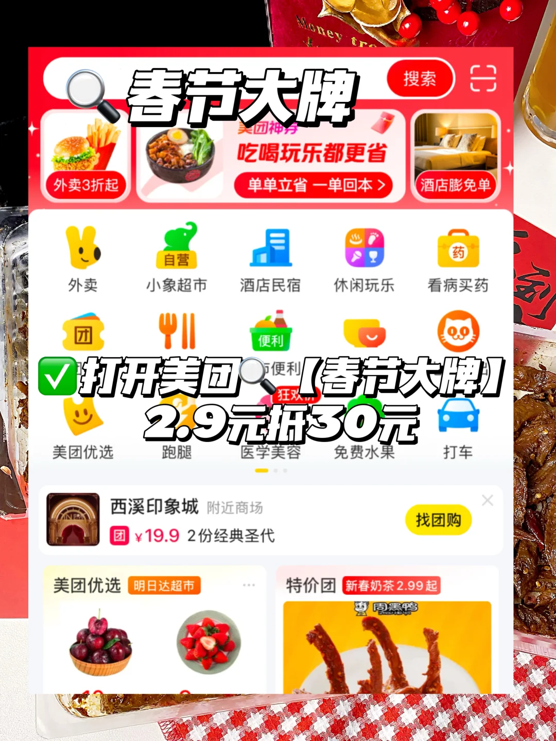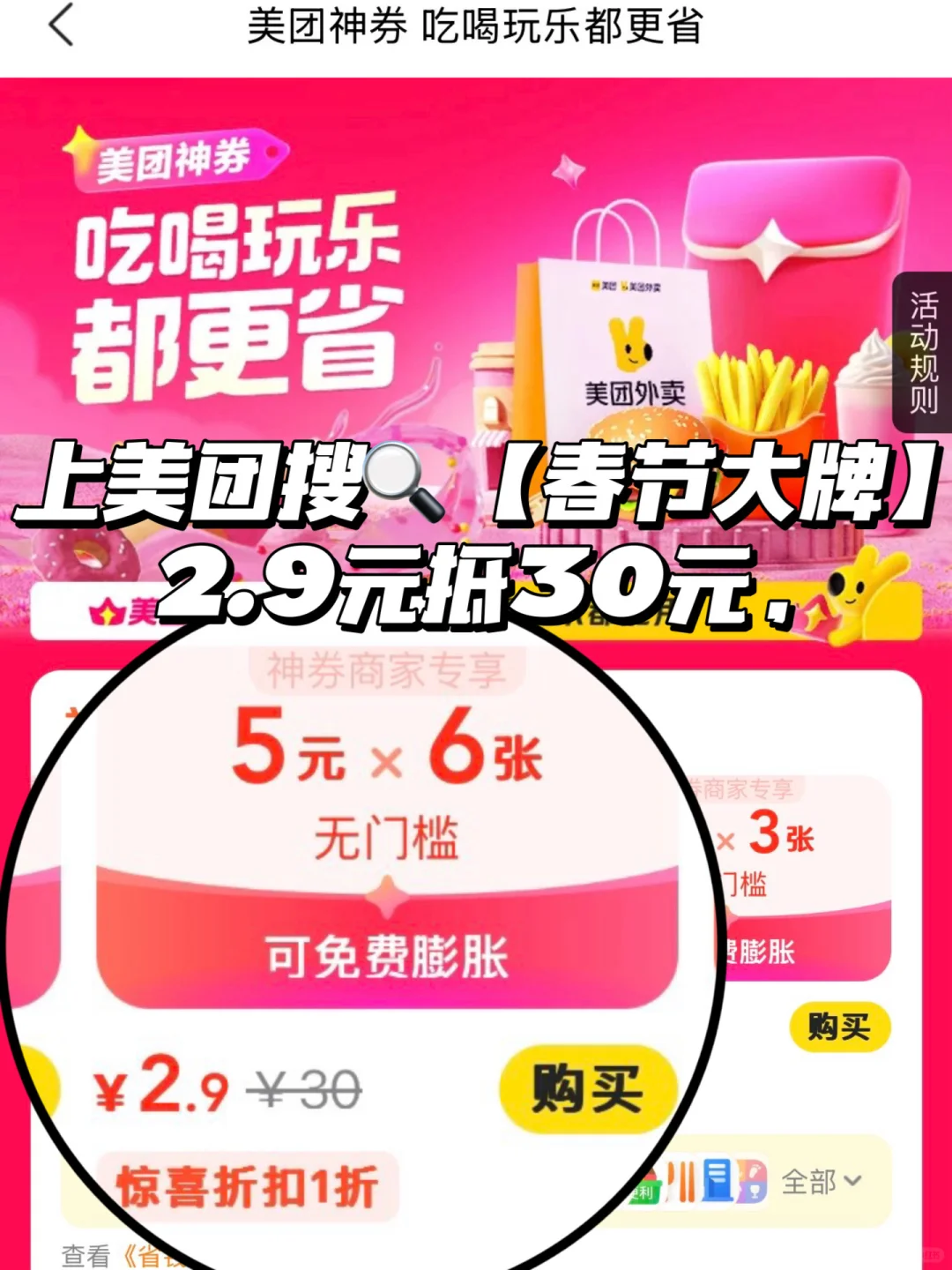 过年美团有券了,上美团搜🔍【春节大牌】,2.9元抵30元!用神券一单回本![派对R]