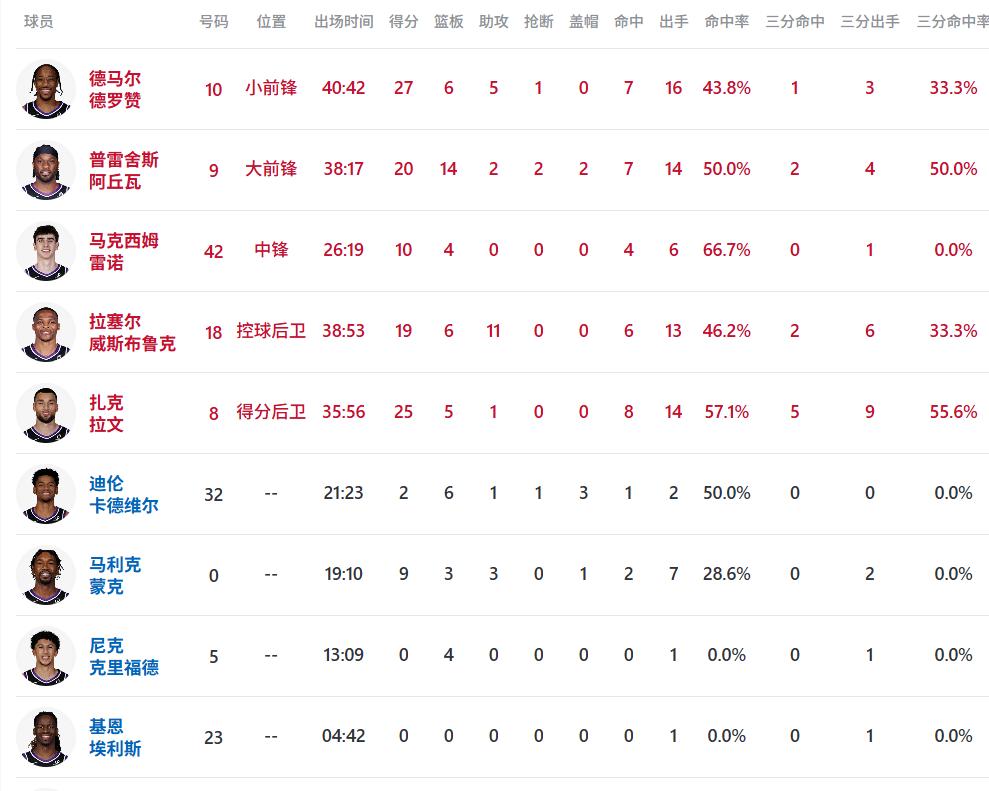 最终,国王主场锁定胜局,以112:101击败尼克斯,顺利拿下三连胜。数据层面,国王首发阵容表现惊艳,全员实现得分上双,核心德罗赞贡献27分6篮板。
