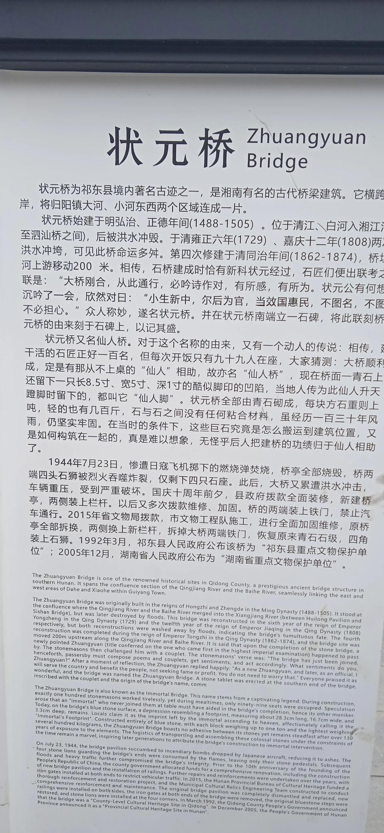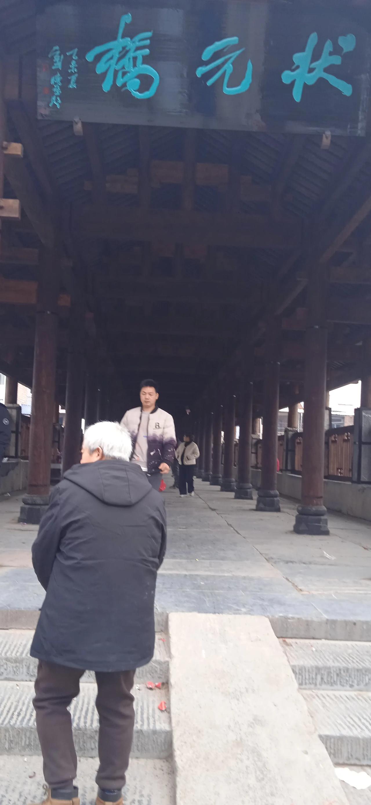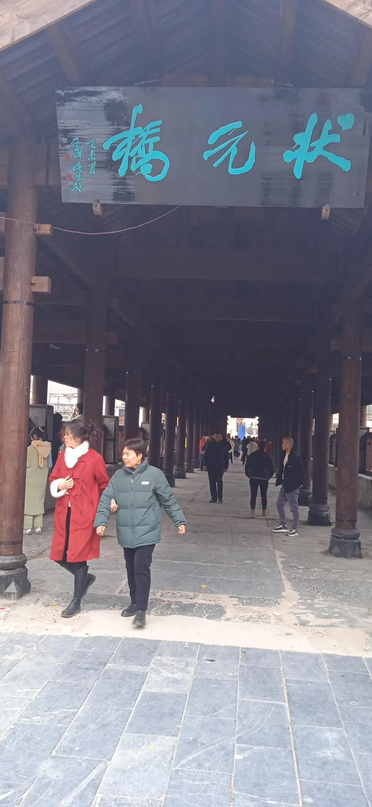 乙己初一 初一喜游状元桥, 游人往来看热闹。 归阳古镇美似锦, 湘江两岸歌如涛。