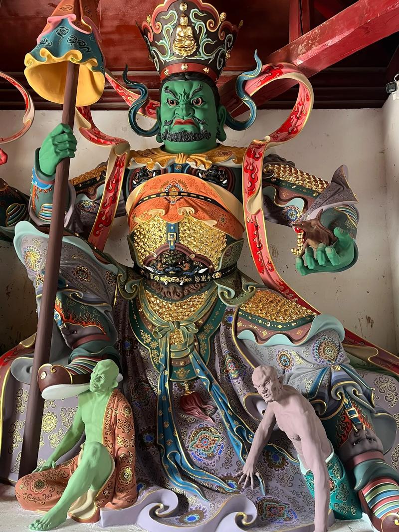 只要有寺庙,就一定有四大天王像。他们都被安置在天王殿中,殿中央为笑和尚弥勒佛(即布袋和尚),四大天王分列两旁。天王像大多威武凛然,其中以杭州灵隐寺的四大天王像最为精绝。它们造型优美,色彩斑斓,表情动人,极其传神,令人赞叹不已。