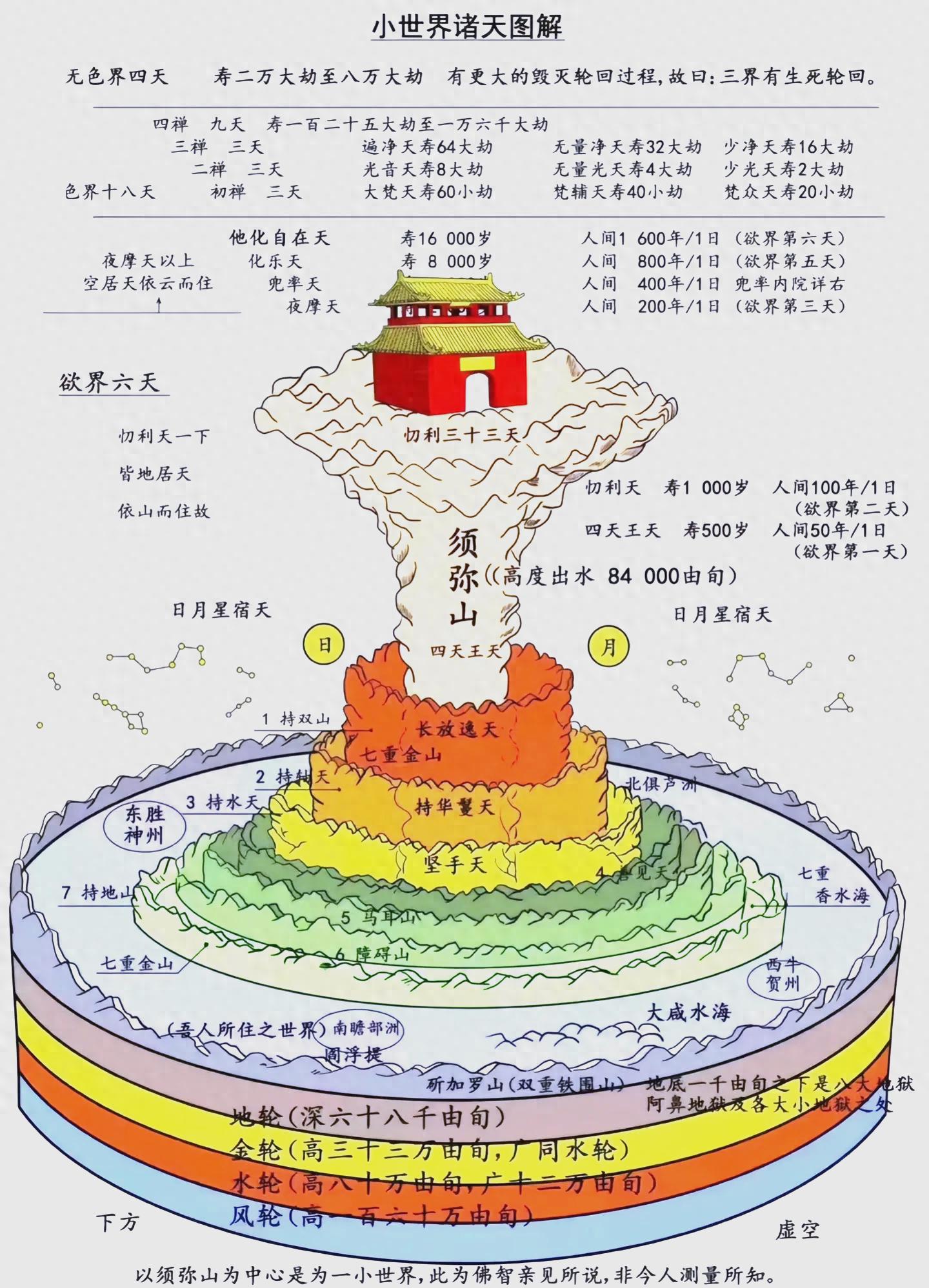 佛教吸取印度古代神话传说和古印度教中关于 “天” 的种种说法,提出 “三界” 说。三界即欲界、色界、无色界,世间一切 “有情众生” 皆在三界中 “轮回” 不已。只有成佛,才能超脱三界之外,进入不生不灭的西方净土 ——“极乐世界”。