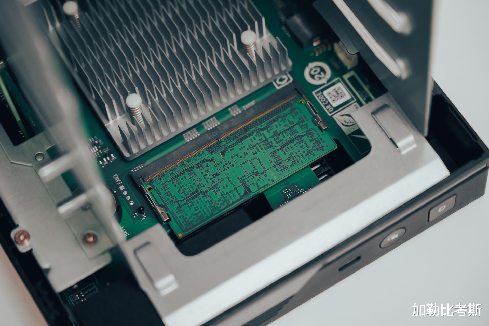 可以看到,在硬盘槽边上的内存所在区域,这次采用的是16GB DDR5内存,个人也可以更换32G。但是QTS系统来说,16G肯定够用。