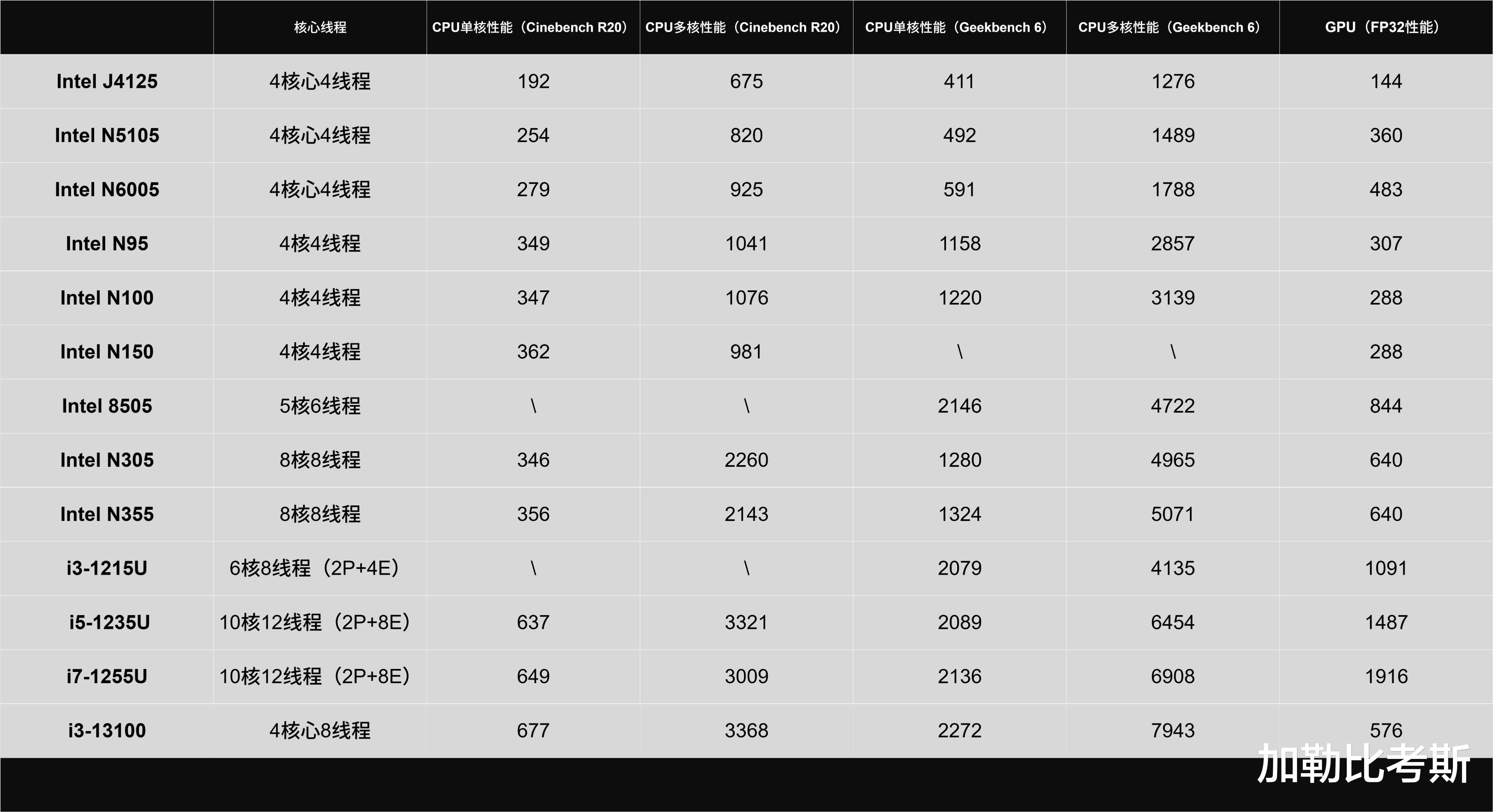 首先说说新品的性能,为什么说是6款新品呢?因为这次发布Qu405、Qu605、Qu805每个型号又多了Lite版,类似于青春版,处理器则换成N150处理器,这几款处理器性能如果不太清楚差距,可以看看这张图。