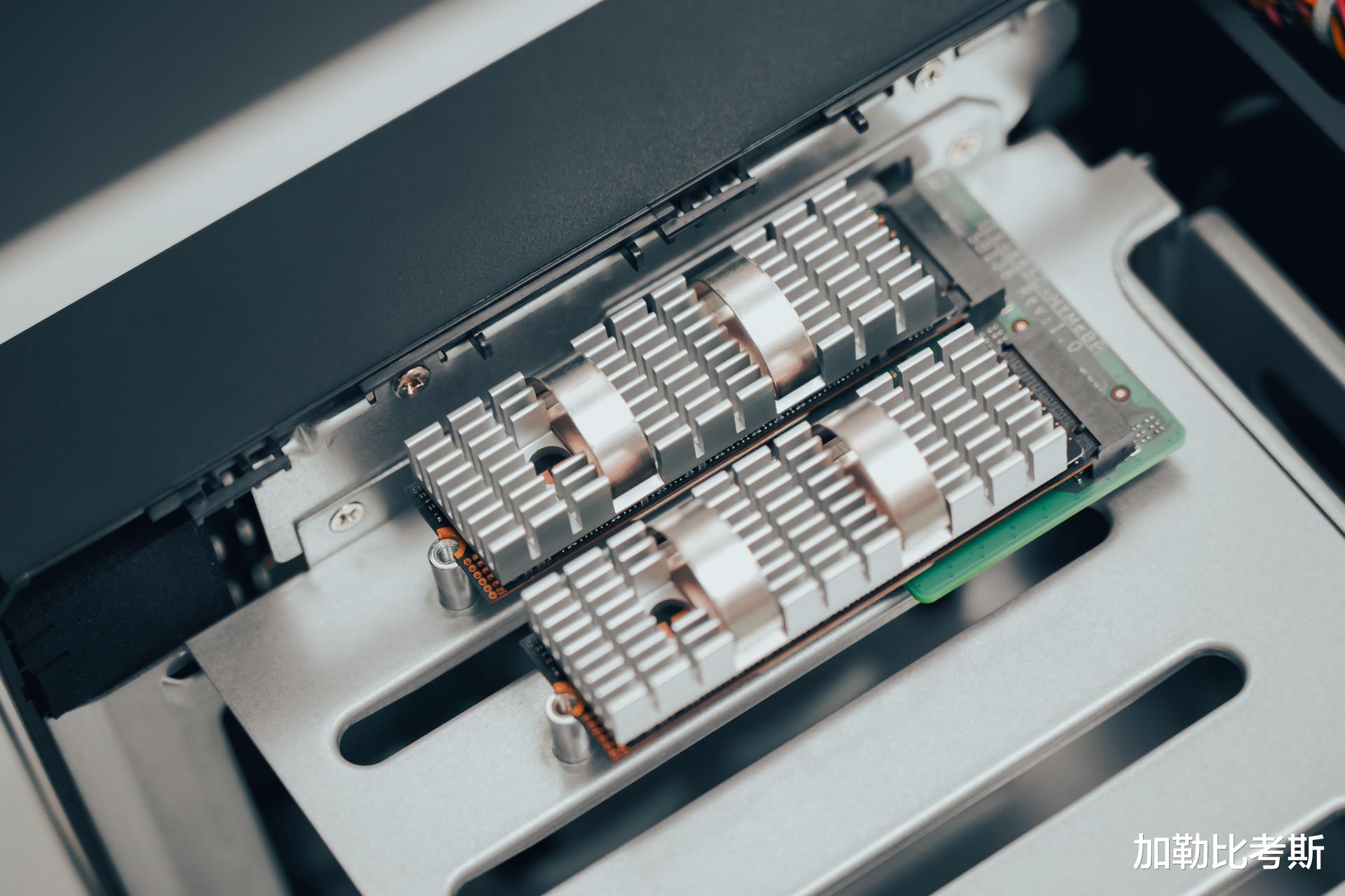 威联通Qu805支持2个M.2 NVMe SSD盘位,SSD盘位带宽是Gen3x1,1000MB/s的速度,足够这台NAS使用。威联通还给了2个超大的SSD散热片,可以看到贴上散热片,SSD你都看不到。但是这个速度真的需要散热吗?不需要的啊。