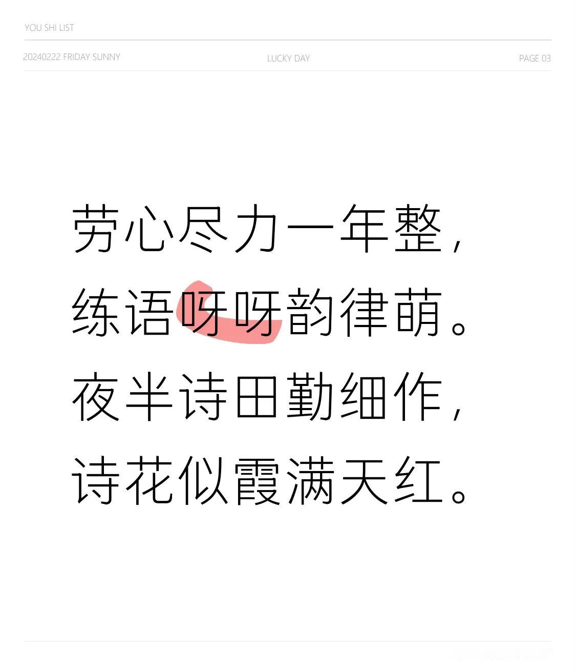 劳心尽力一年整, 练语呀呀韵律萌。 夜半诗田勤细作, 诗花似霞满天红。
