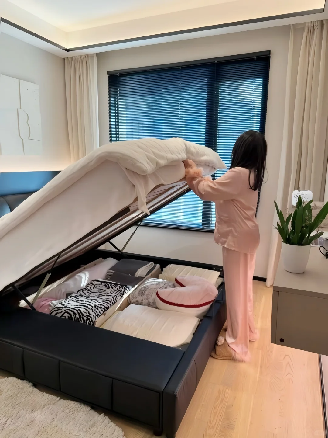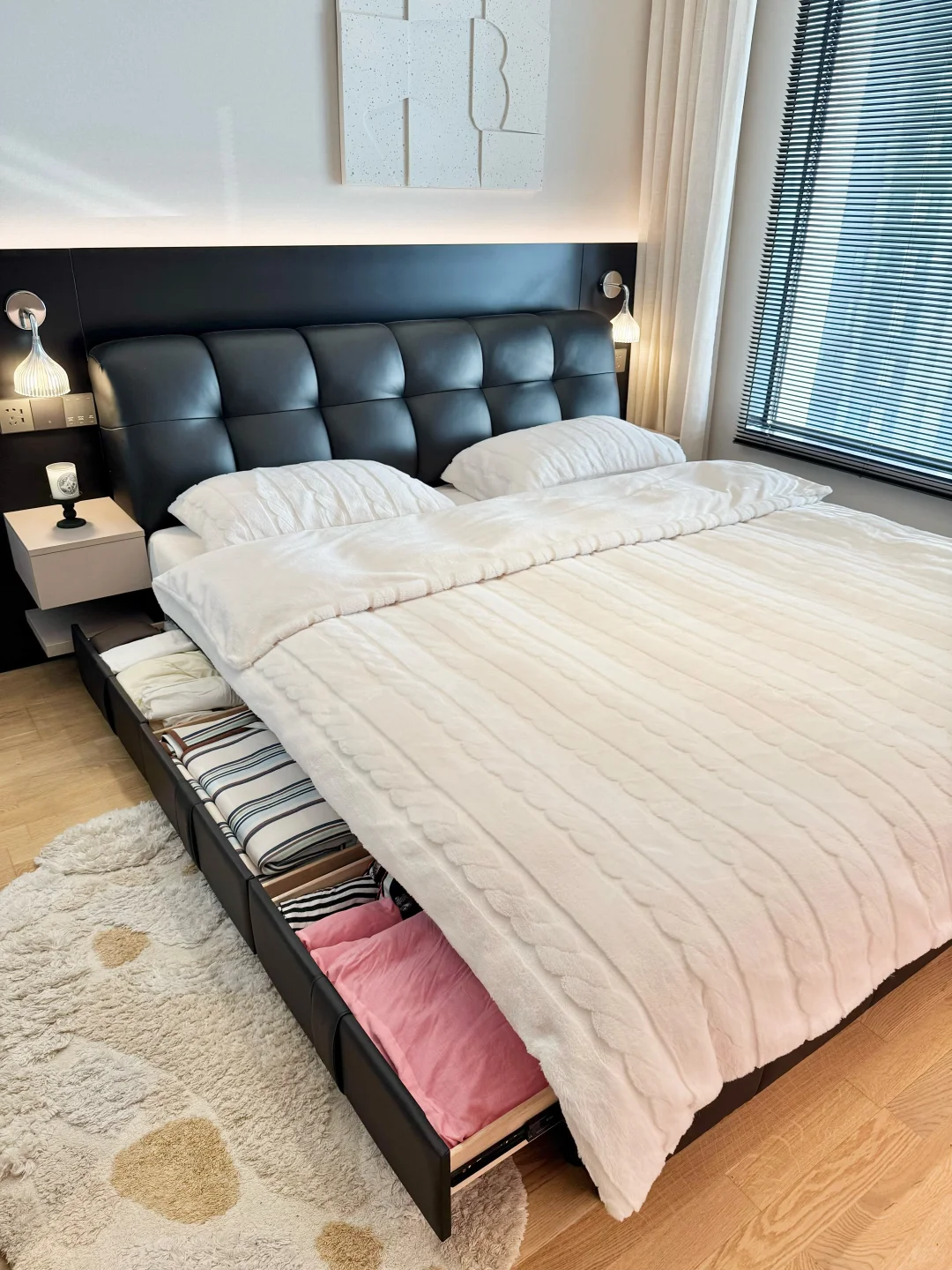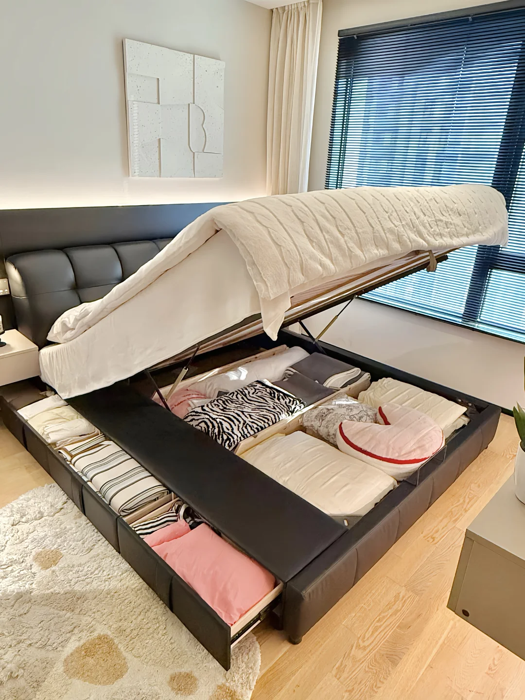 用了一年的真皮泡芙储物床经常被姐妹们追问真实感受~ 我只想说我是真后悔…后悔没早买! 储物床不仅帮我这种小户型卧室收纳了不少东西,而且这种大件的东西网购是真的香。 为了不踩坑,今天我就给大家分享一下网购储物床到底应该怎么选! ✅选真皮头层牛皮的 真皮的更透气,而且用久了不掉皮。什么纳帕皮、超纤皮不要选。我选的是加厚头层牛皮的。大家选皮质家具的时候,记得提前找商家寄小样,确认皮质和颜色,以免货不对板。 ✅ 排骨架要选实木全榉木的 榉木排骨架更扎实。铺板间隙越小越好,因为间隙越小越能有力承托床垫。 我选的这款床架间距只有 1.5CM,加密铺板。外框厚度大于 3CM,排骨条厚度也有 1.5CM ,睡了一年随便怎么翻身都没异响。 ✅床框要选全实木框架的 很多低价宣称实木床的其实只有排骨架是实木的。而床头包裹进去的很多都是密度板的不环保。我选的这款床头有可视窗口,直接可以看到里面的材质,全实木的睡起来更放心。 ✅小户型选择储物床增加收纳 小户型要选我家这种箱框储物床。 床板撑开能放下一年四季的床品、棉被和毯子等大件🧺。 侧面三个抽屉可以收纳内衣裤、睡衣和袜子等,日常拿取方便。 箱框一定要选带实木底板的,这样储物才不会积灰、受潮。 而且要选带气压结构的,抬起有助力,女生也能独自轻松抬起。 ✅靠背要舒服 现在都喜欢靠在床上玩手机追剧。所以床头要选择有高回弹海绵和倾斜角度的,这样靠着有支撑才舒服。 ✅ 下单前问清楚尺寸、安装和售后 下单前记得问清楚床的外框尺寸。小户型更适合我家这种齐边款的,不占走道空间。 选商家能送货上门并有安装服务的。这样既可以避免后期自费,又不用担心出现安装导致的售后问题和安装师傅扯皮。 还要选有环保检测报告的,这样更放心。 总之,大件家具不管是线上还是线下退换货都不方便,所以大家一定要好好做功课再入手。希望这些经验能帮到大家!要是还有其他避坑技巧,欢迎在评论区分享!