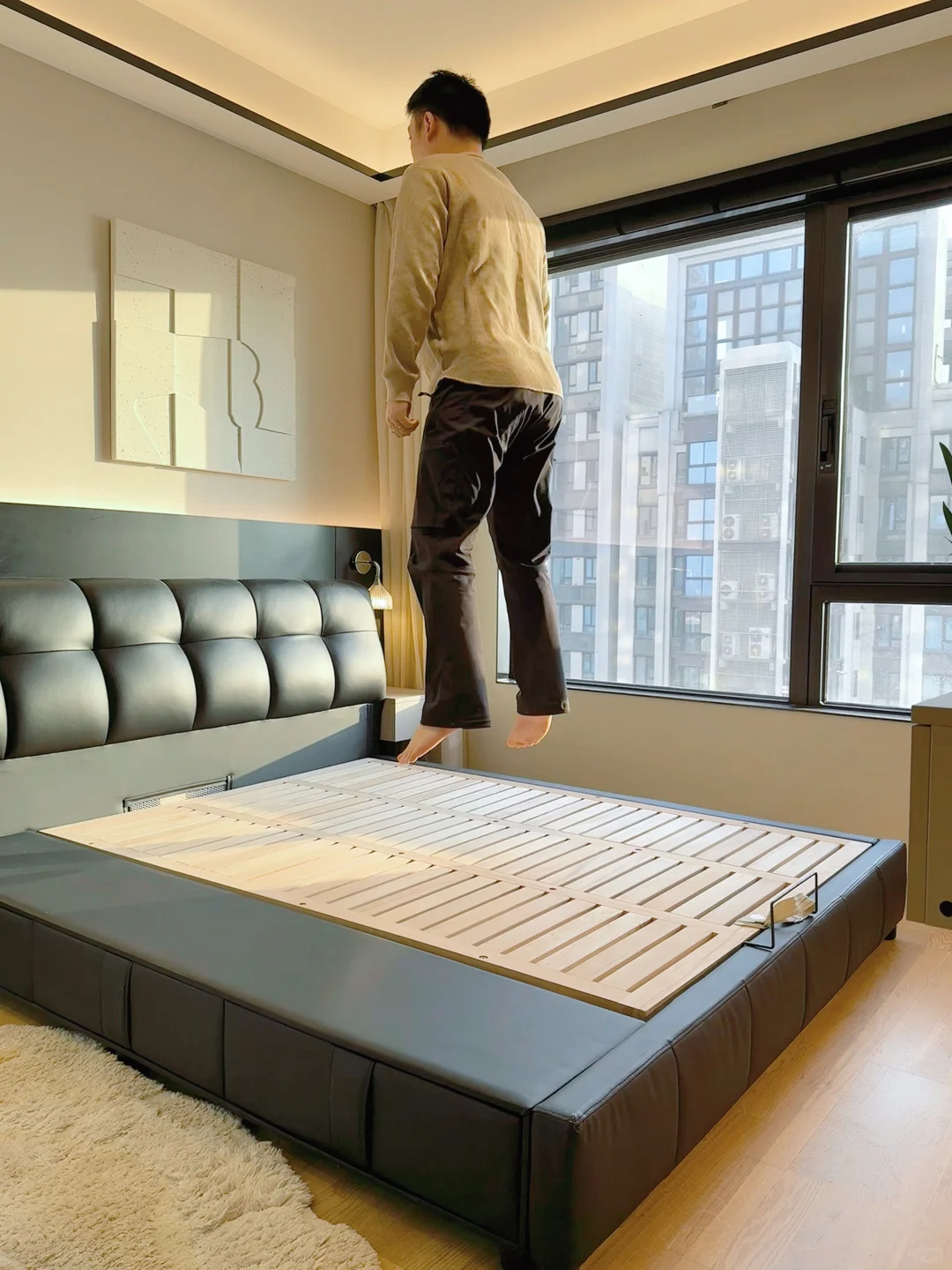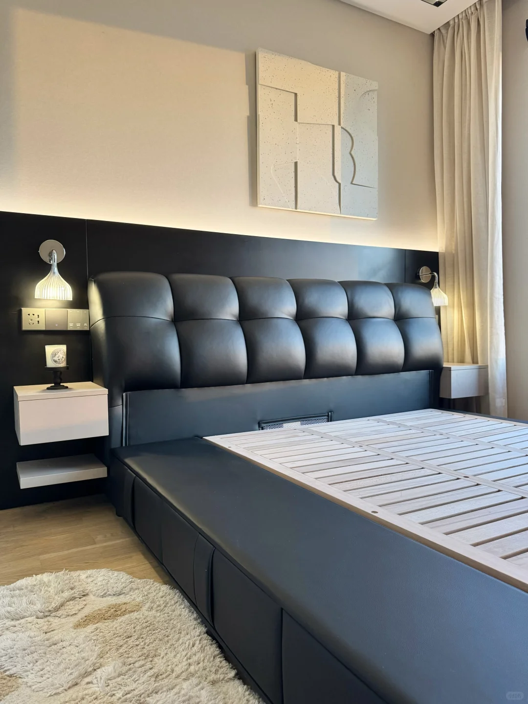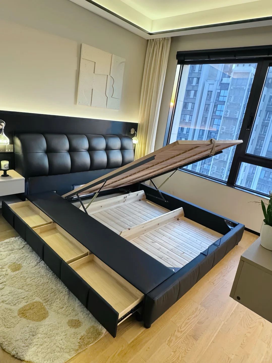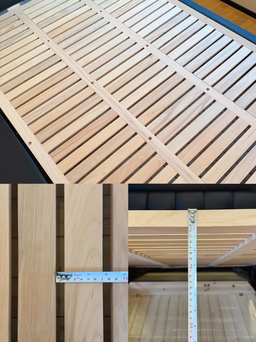 用了一年的真皮泡芙储物床经常被姐妹们追问真实感受~ 我只想说我是真后悔…后悔没早买! 储物床不仅帮我这种小户型卧室收纳了不少东西,而且这种大件的东西网购是真的香。 为了不踩坑,今天我就给大家分享一下网购储物床到底应该怎么选! ✅选真皮头层牛皮的 真皮的更透气,而且用久了不掉皮。什么纳帕皮、超纤皮不要选。我选的是加厚头层牛皮的。大家选皮质家具的时候,记得提前找商家寄小样,确认皮质和颜色,以免货不对板。 ✅ 排骨架要选实木全榉木的 榉木排骨架更扎实。铺板间隙越小越好,因为间隙越小越能有力承托床垫。 我选的这款床架间距只有 1.5CM,加密铺板。外框厚度大于 3CM,排骨条厚度也有 1.5CM ,睡了一年随便怎么翻身都没异响。 ✅床框要选全实木框架的 很多低价宣称实木床的其实只有排骨架是实木的。而床头包裹进去的很多都是密度板的不环保。我选的这款床头有可视窗口,直接可以看到里面的材质,全实木的睡起来更放心。 ✅小户型选择储物床增加收纳 小户型要选我家这种箱框储物床。 床板撑开能放下一年四季的床品、棉被和毯子等大件🧺。 侧面三个抽屉可以收纳内衣裤、睡衣和袜子等,日常拿取方便。 箱框一定要选带实木底板的,这样储物才不会积灰、受潮。 而且要选带气压结构的,抬起有助力,女生也能独自轻松抬起。 ✅靠背要舒服 现在都喜欢靠在床上玩手机追剧。所以床头要选择有高回弹海绵和倾斜角度的,这样靠着有支撑才舒服。 ✅ 下单前问清楚尺寸、安装和售后 下单前记得问清楚床的外框尺寸。小户型更适合我家这种齐边款的,不占走道空间。 选商家能送货上门并有安装服务的。这样既可以避免后期自费,又不用担心出现安装导致的售后问题和安装师傅扯皮。 还要选有环保检测报告的,这样更放心。 总之,大件家具不管是线上还是线下退换货都不方便,所以大家一定要好好做功课再入手。希望这些经验能帮到大家!要是还有其他避坑技巧,欢迎在评论区分享!