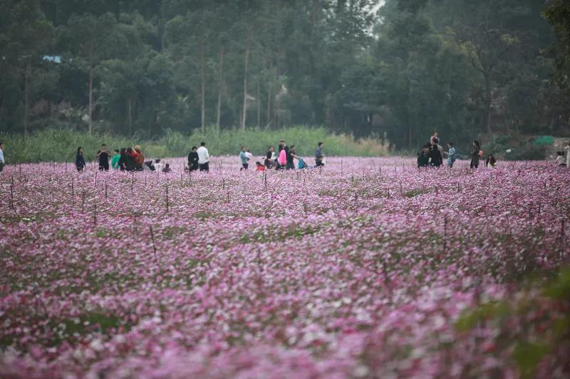 春景玉颜 花海缤纷映玉颜 双珠并立笑嫣然 春风轻拂花含笑 莺歌燕舞霞满天