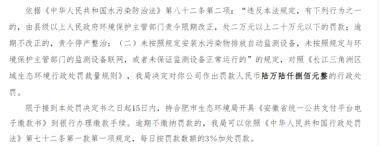 近日,合肥市生态环境局披露行政处罚信息,因未保证自动监测设备正常运行,合肥市水务环境建设投资有限公司被处罚款6.68万元。