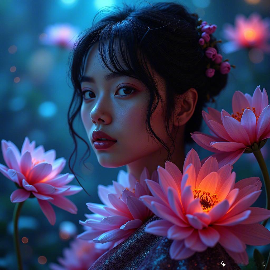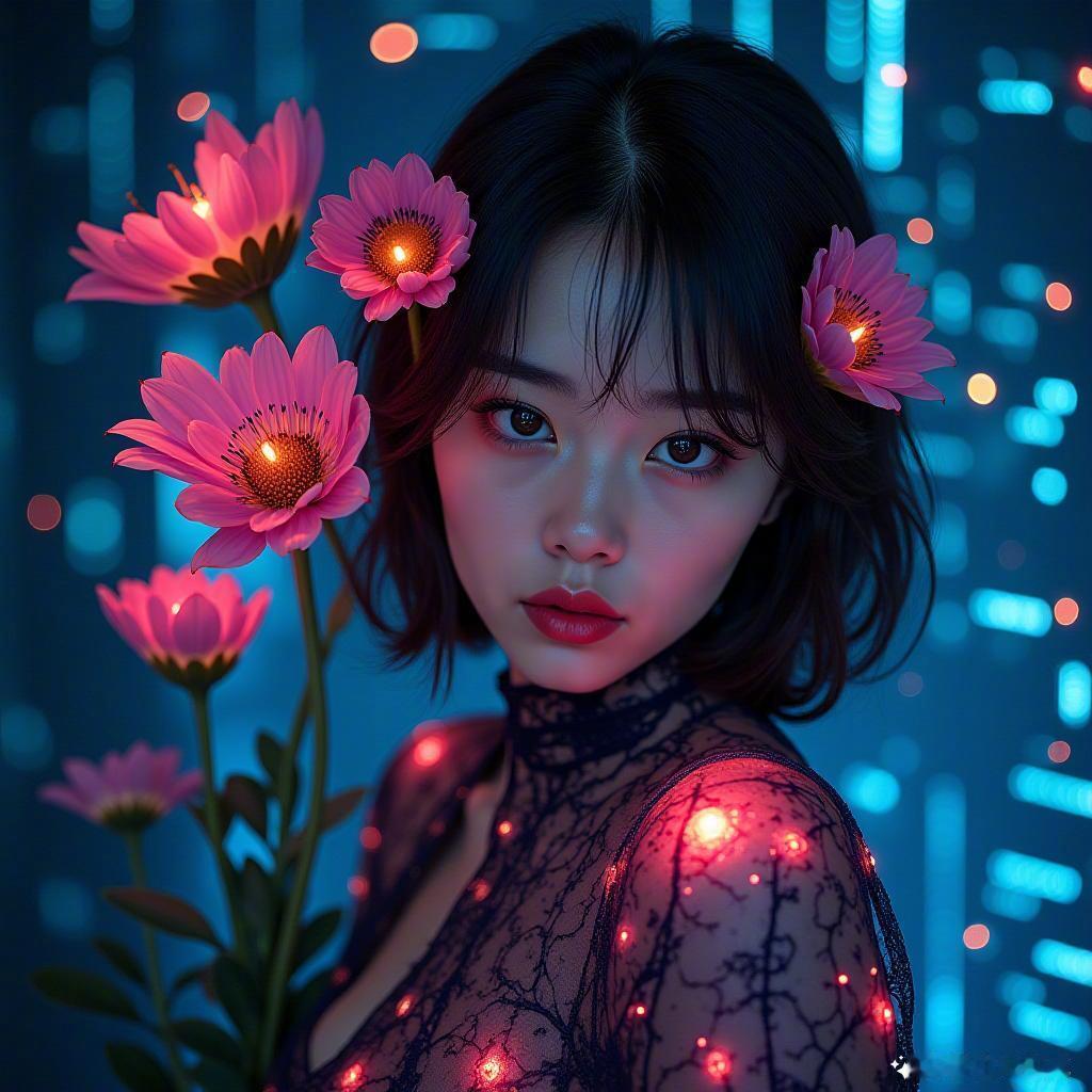 未来的美丽就在眼前,科技与自然的奇妙结合🌸✨,让心情飞扬! 未来科技 美丽女性 梦幻花海 (本内容由AI生成)