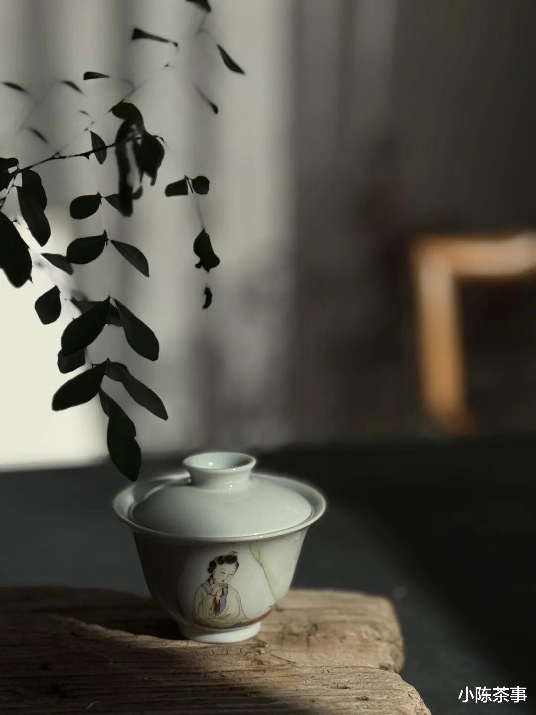 身姿纤细,仪态大方,皮肤光滑,化着精致的妆容,穿着轻盈的茶服,保养得当的纤纤玉手,执起茶匙,往盖碗中投茶,再仪态万方地执起茶壶,注水,出汤。