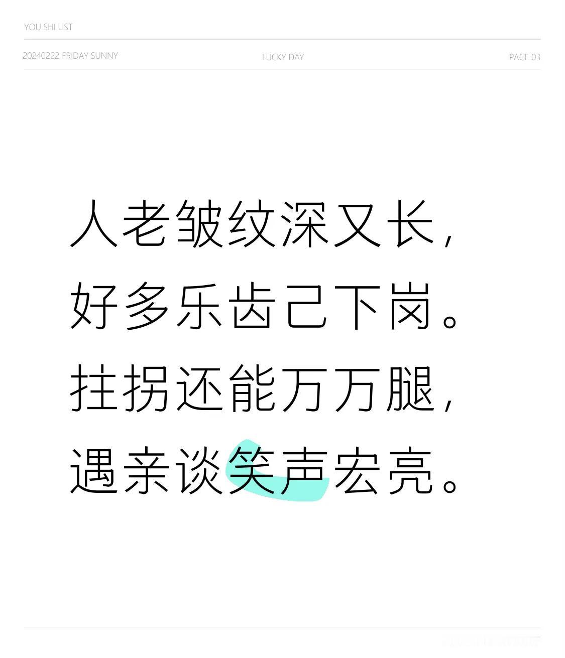 人老皱纹深又长, 好多乐齿己下岗。 拄拐还能万万腿, 遇亲谈笑声宏亮。