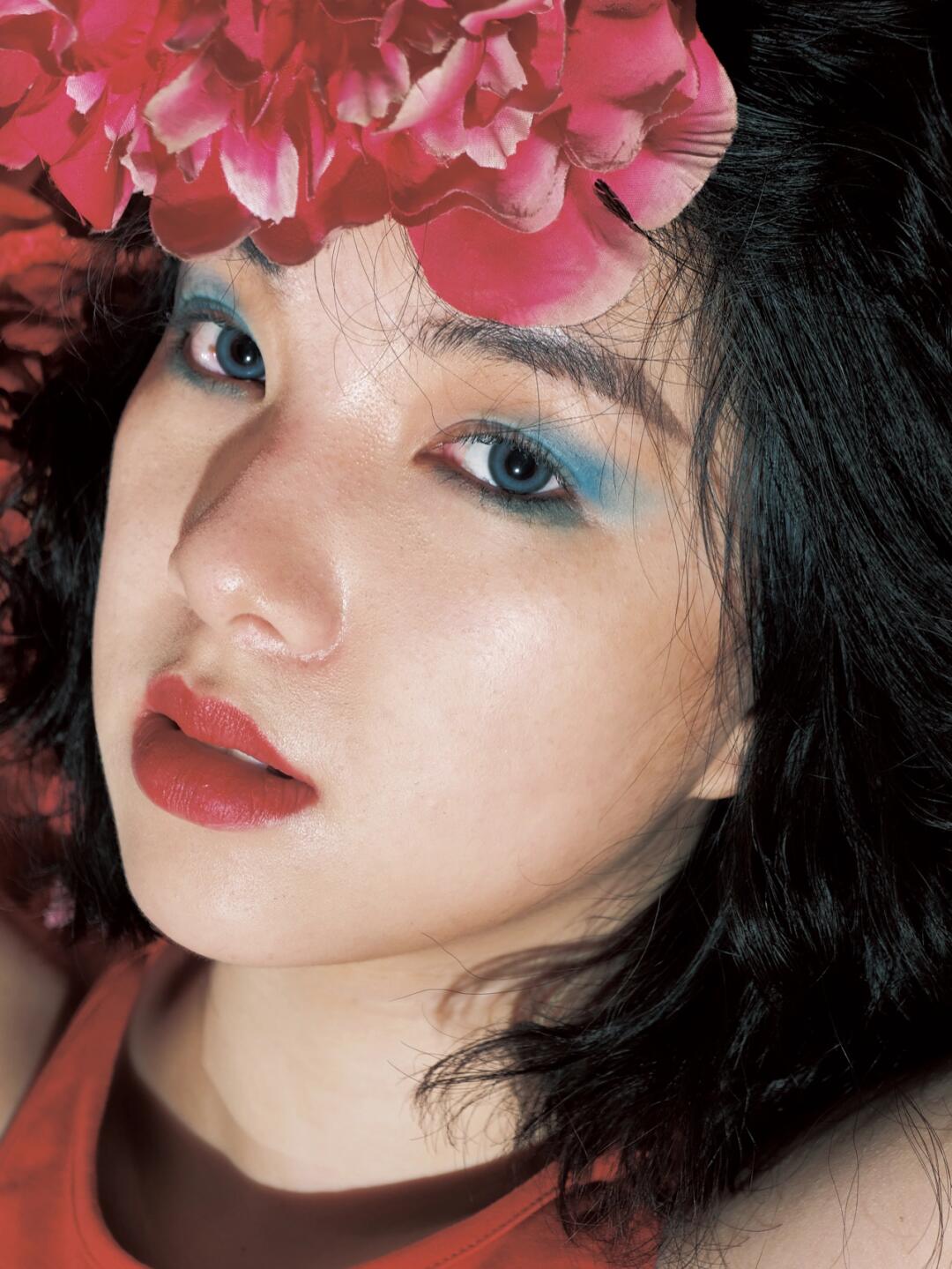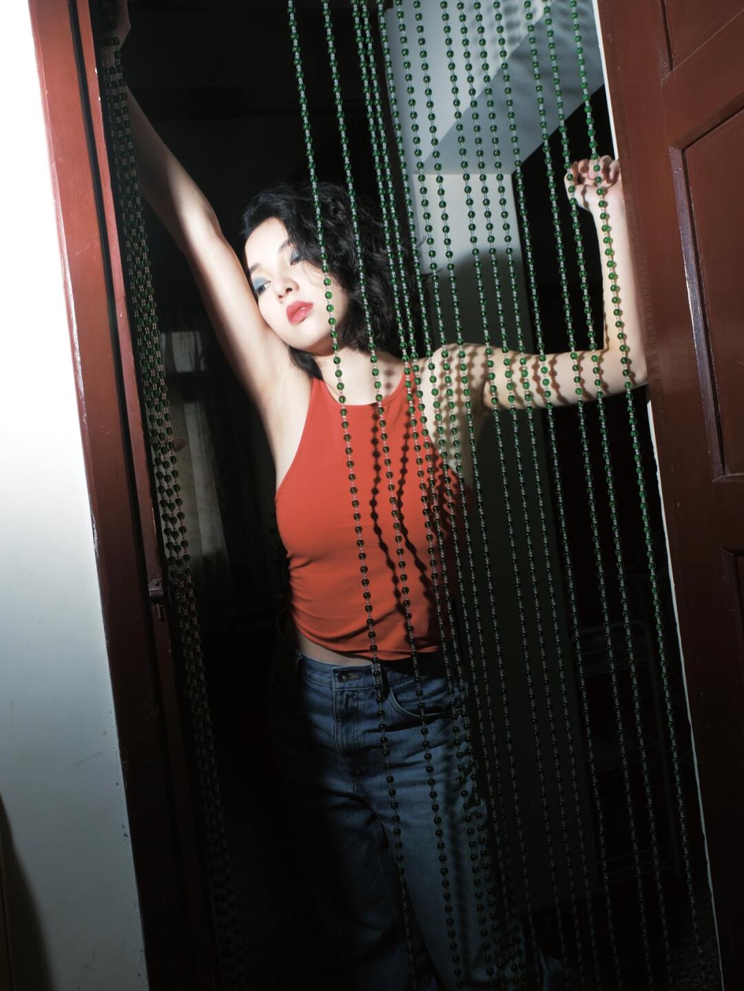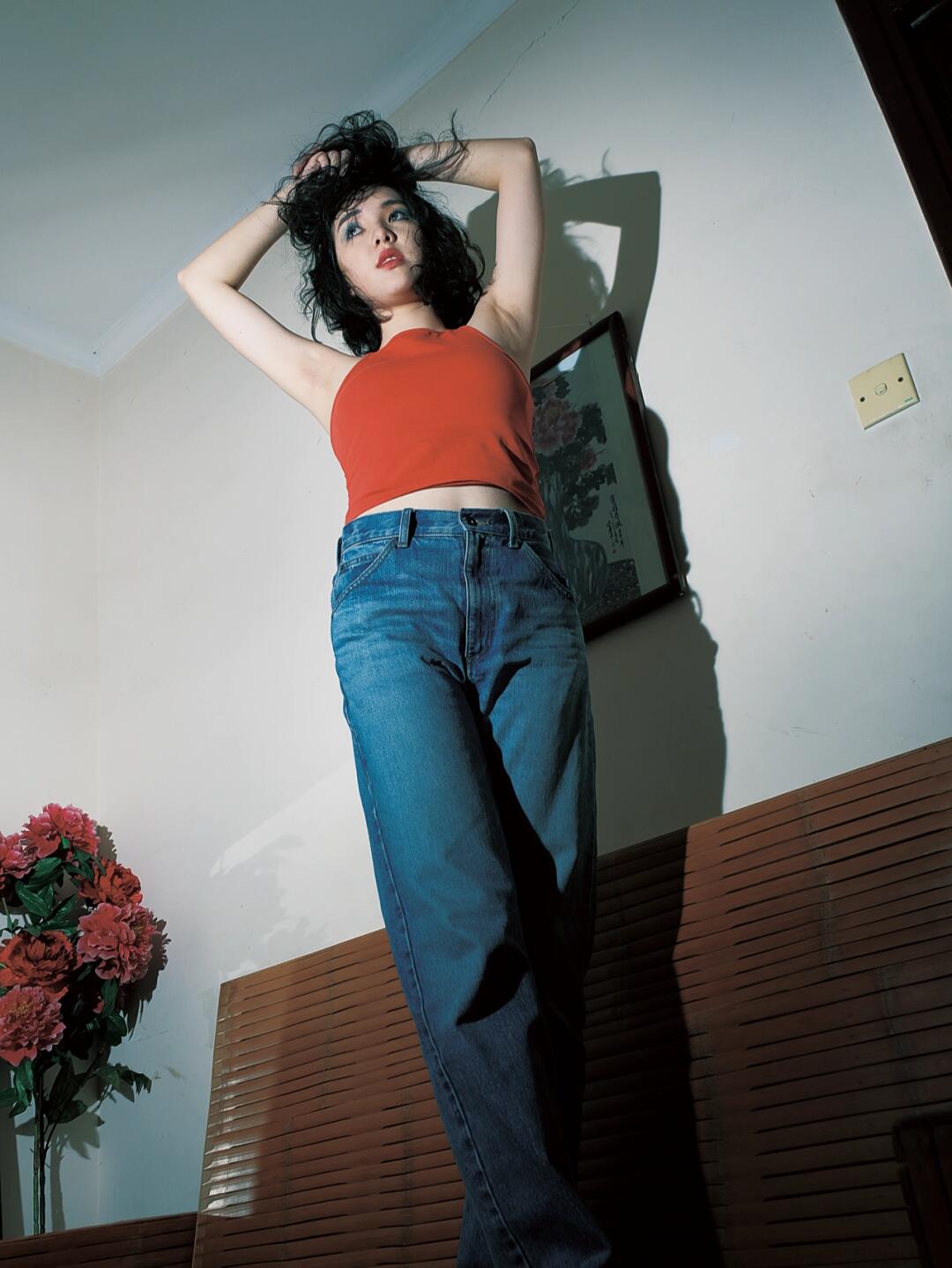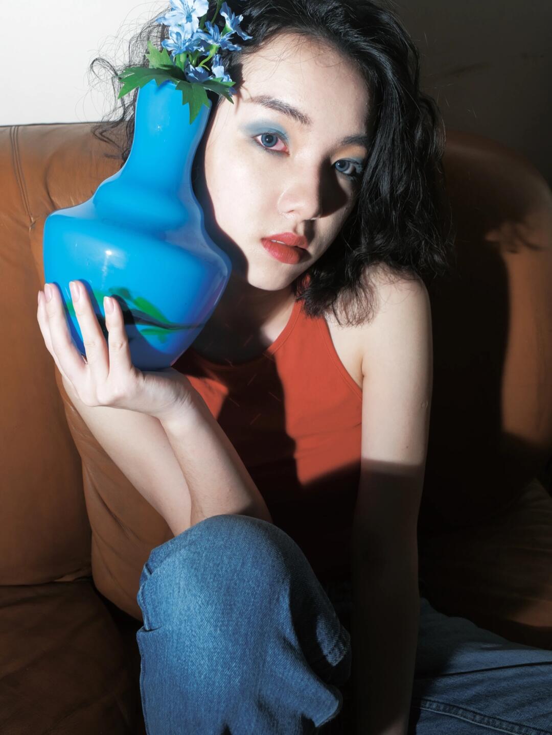 别让梦的羽毛浸没我 🔴🔵 红色背心搭配蓝色牛仔裤 蓝色眼影点缀 闪光灯直闪带来的奇妙反应/