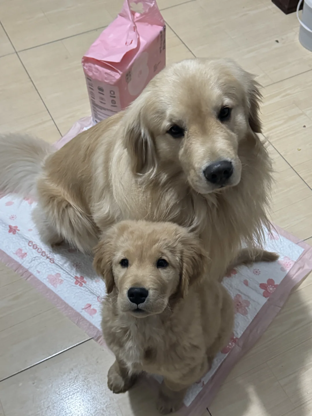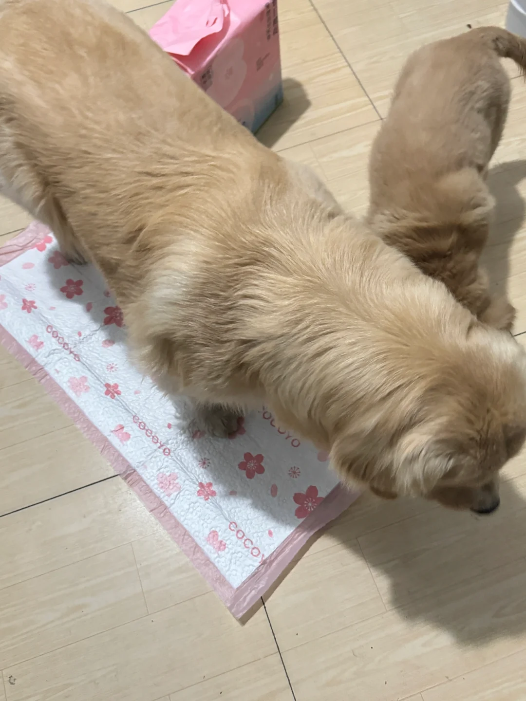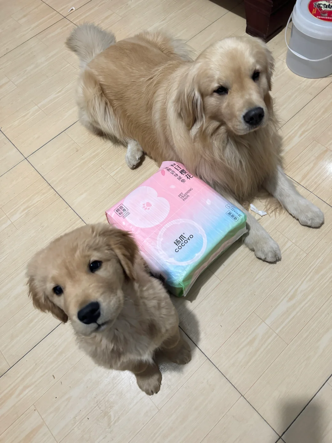 家人们谁懂啊 养了两只一摸一样的小金毛 表情五官都一样 行为习惯也都很相似 真的太可爱了 哦耶是年前刚接回来的小宝,是我们ok的大儿子,小狗狗到家那尿垫肯定是必须要有的,辛亏家里经常备的有,ok有时候下雨天不想出门,或者吃零食那种跟碎的东西,都会给它铺上一片真的很方便 cocoyo的尿垫我们真的是一直在用,从草地系列推荐现在的春日樱花系列,拿到手就是那种很厚的材质,他们两只用都不会漏的,哦耶都没有怎么教,自己就会跑到尿垫上尿尿,真的很👍