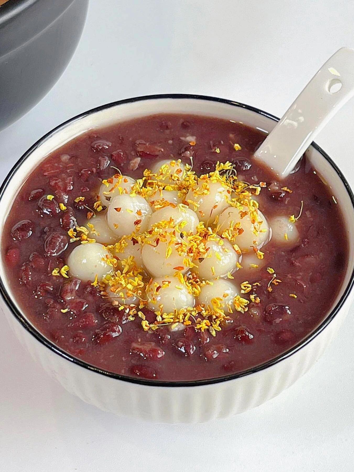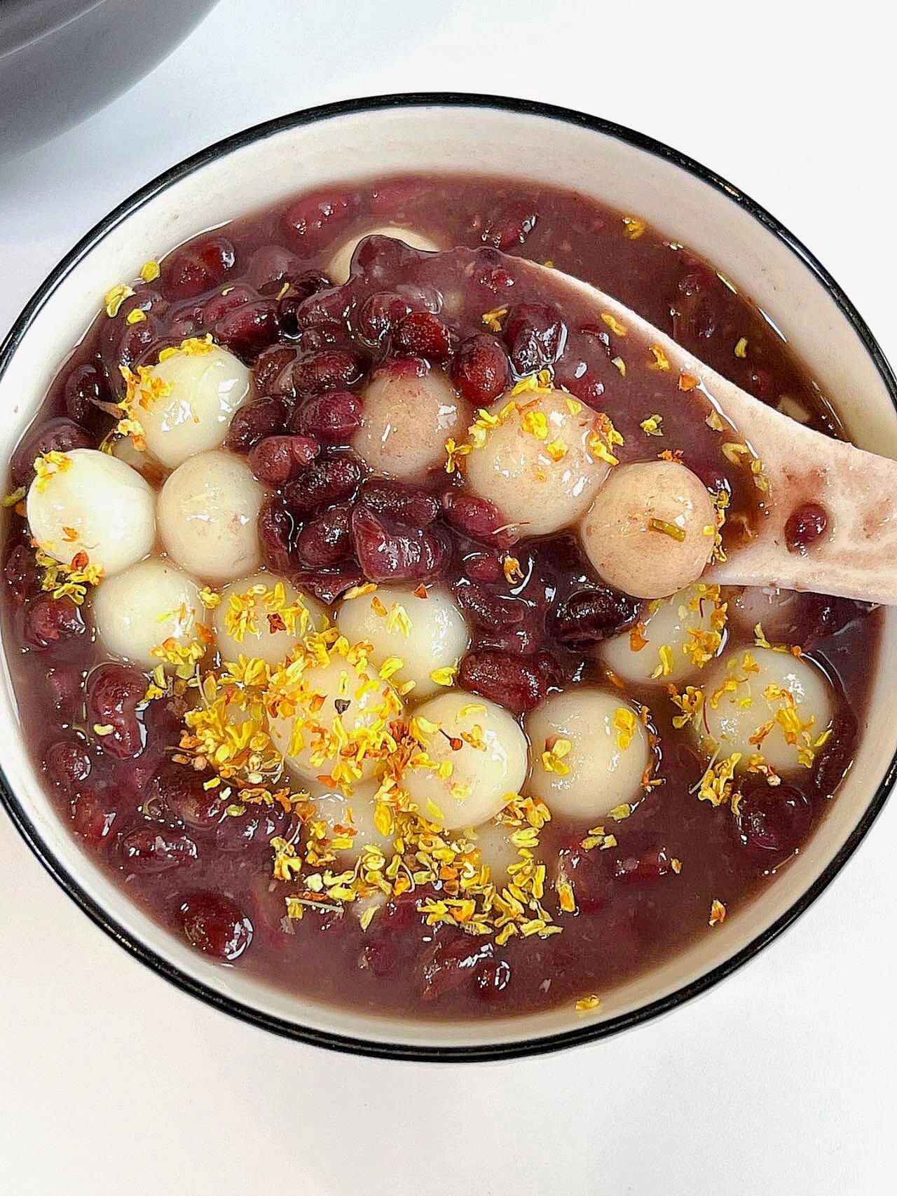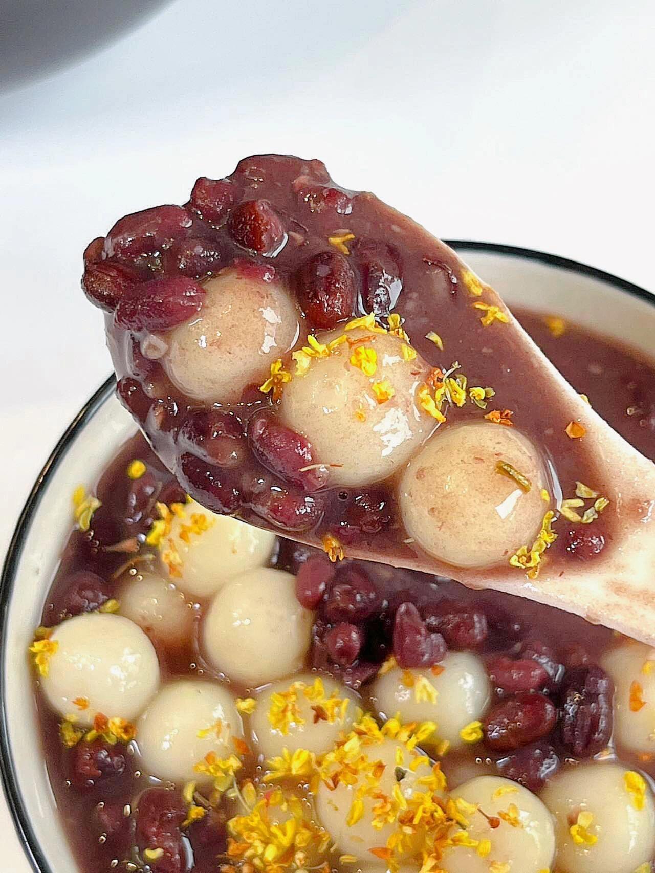 在红豆圆子上撒上一层干桂花,桂花的清香和红豆的甜蜜完美融合,让整道甜品更加诱人。这时候,一碗热气腾腾、甜而不腻的红豆桂花圆子就大功告成啦!