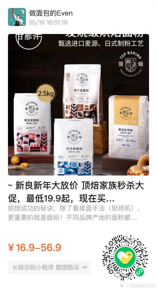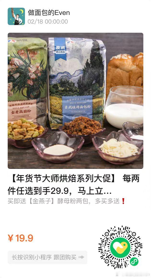 新良大师欧包粉9.9,大黄米汤圆糯米粉9.9,纯享高筋9.9,低糖红豆沙,吉利丁片,雪花饺子粉统统9.9……