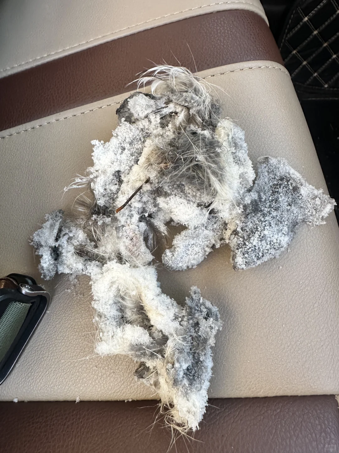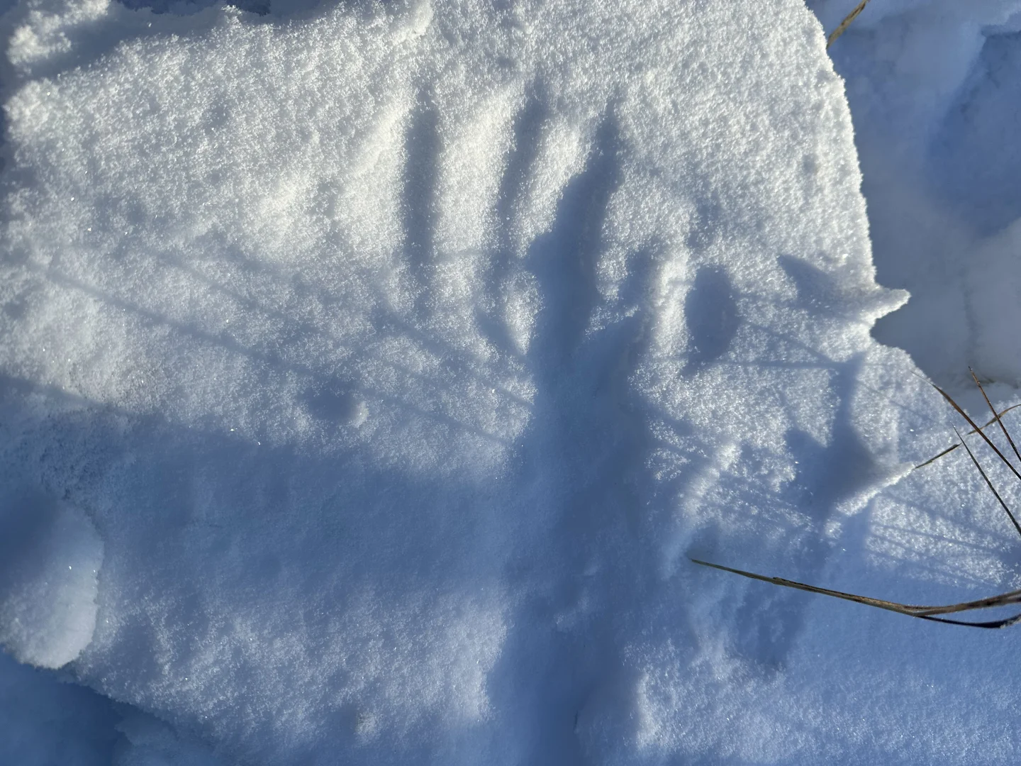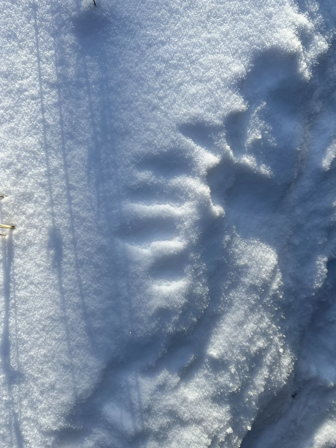 在一条沟里,我们发现了一只被捕食的乌林鸮,雪地上还有它翅膀扑腾挣扎留下的印子(p4、5),周围留有猞猁的脚印(p6),现场还有不少羽毛和碎片(p7、8)盖在上面的雪还算新鲜,看上去应该刚被吃不久[哭惹R]