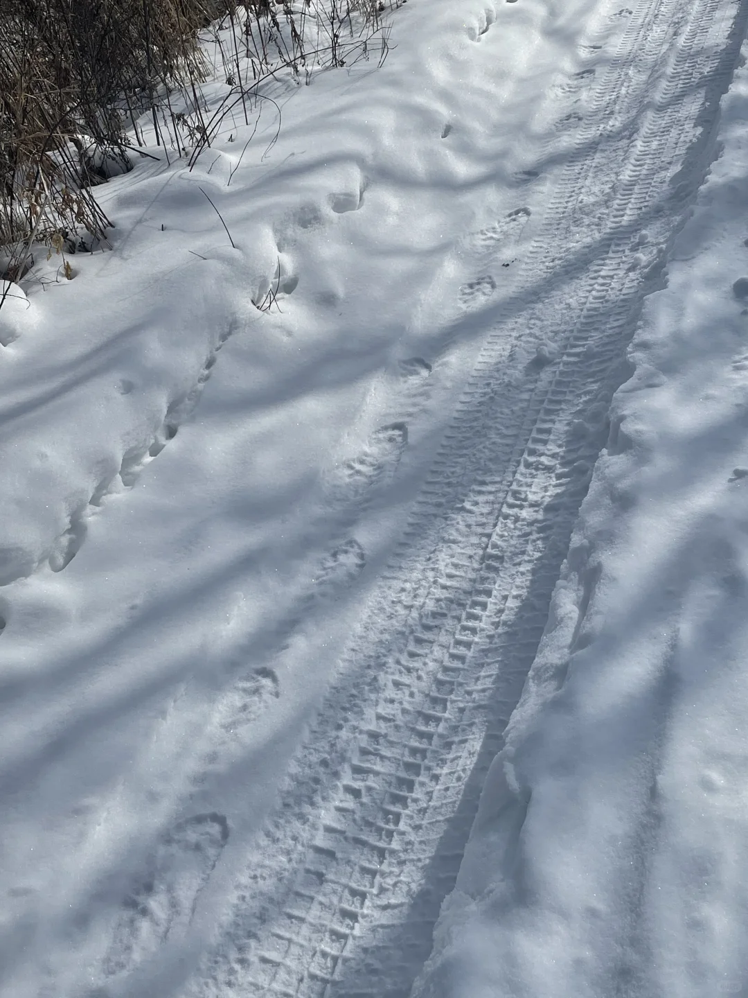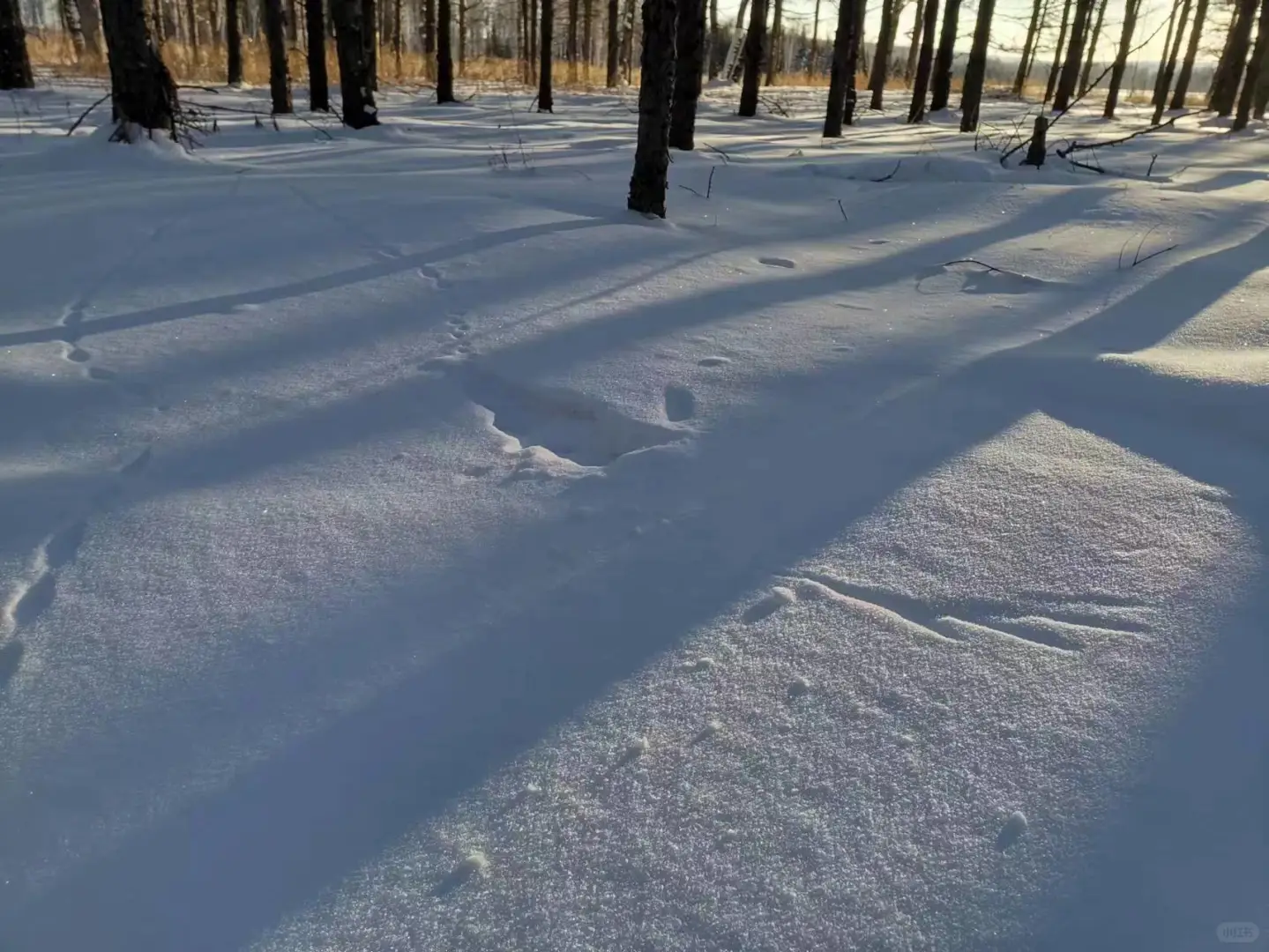 乌林鸮是捕鼠能手,依靠锅盖一样的大脸盘集音,它们能洞察积雪之下鼠类的动向。在雪地上能见到它们捕猎留下的痕迹,像p3就是在一只乌林鸮的领地中,它们穿透积雪捕捉鼠类之后,在雪地上留下的翅膀印。