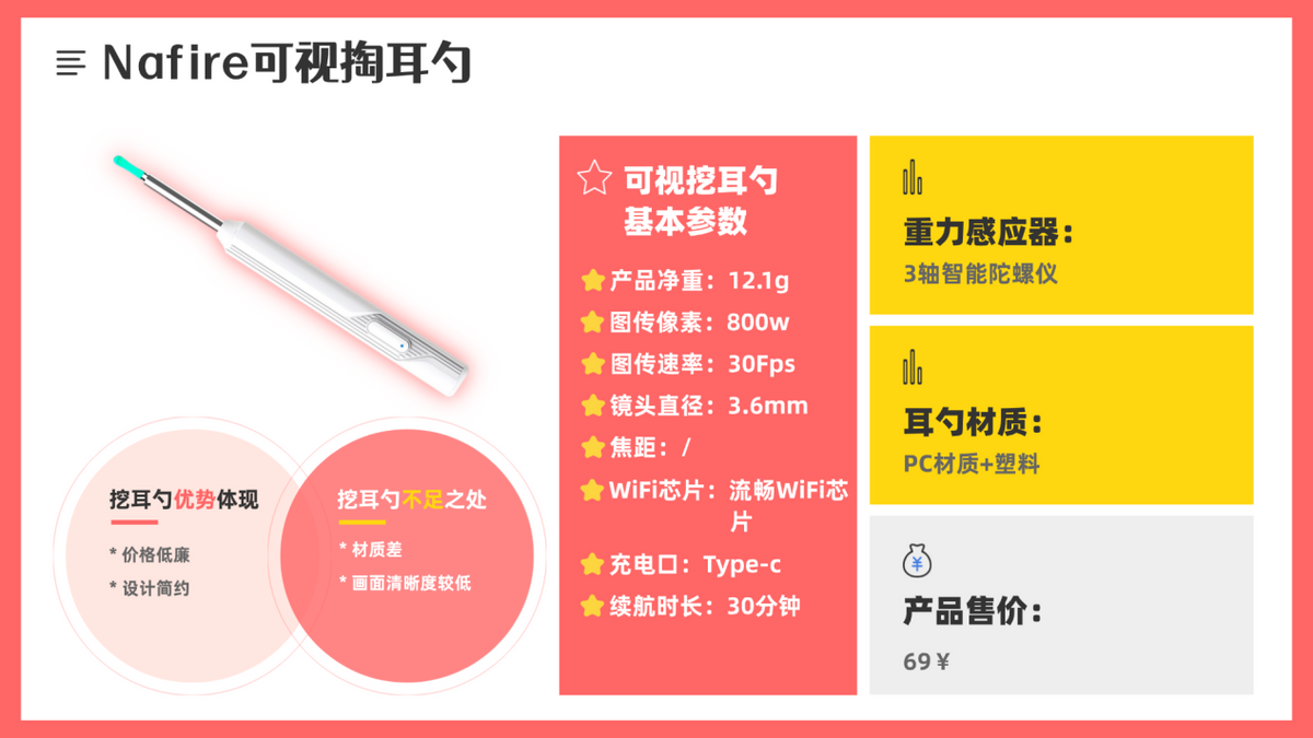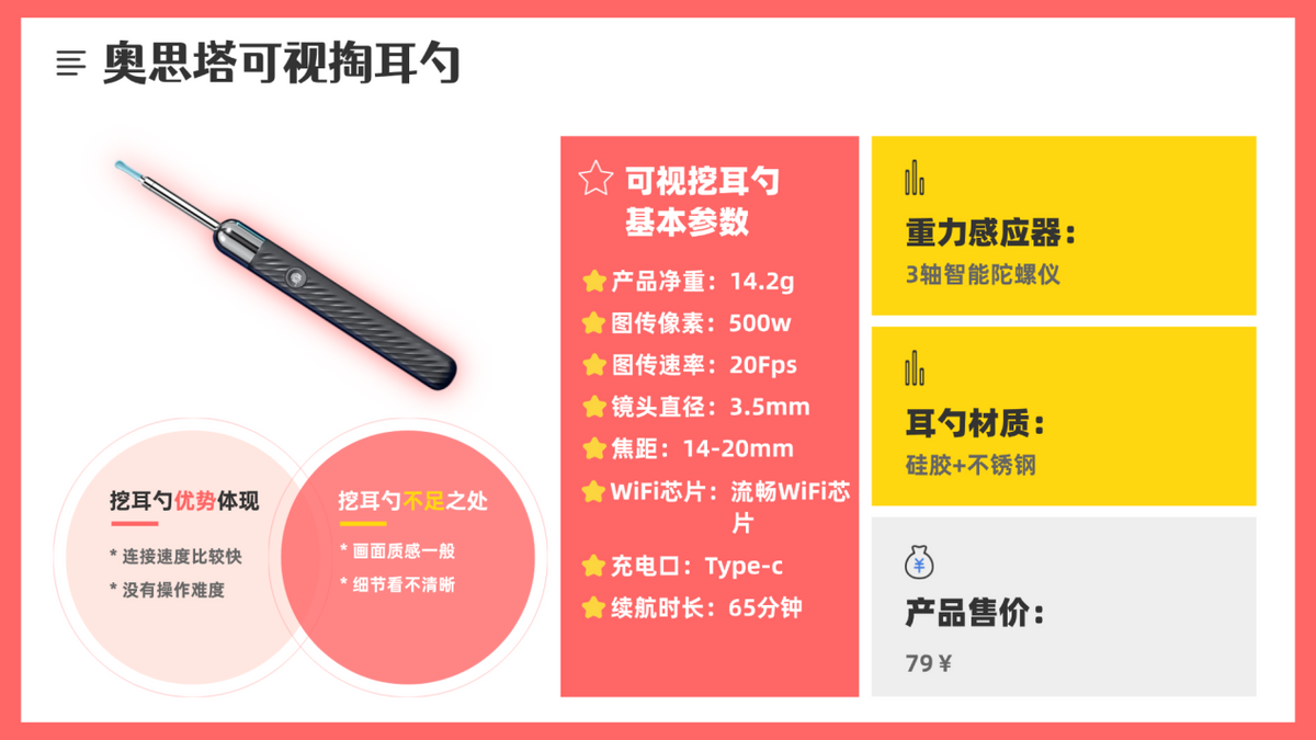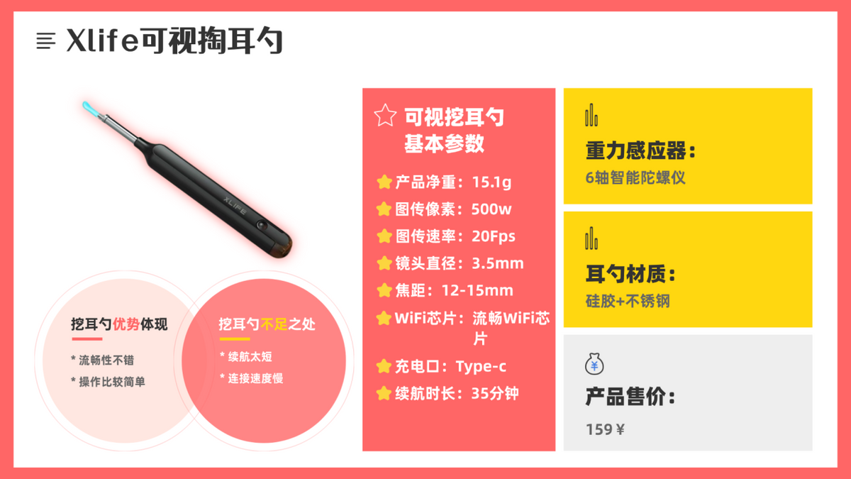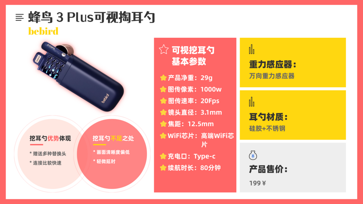 ▶可视掏耳勺真的好用吗?机身极致轻量化设计,净重仅13g,单手操作无负担,便携性突出。搭载1000万像素内窥镜,图传速率20FPS,可清晰呈现耳道大体结构。