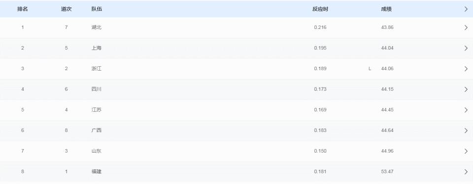 湖北队有两名国家接力队主力,特别是朱俊颖的发挥很出色,为湖北队拉大了优势。最终湖北队以43秒8夺冠。上海队44秒04获得亚军,陈妤颉所在的浙江队以44秒06获得第三,四川队44秒15第四,江苏队44秒45第五,广西队44秒64第6。