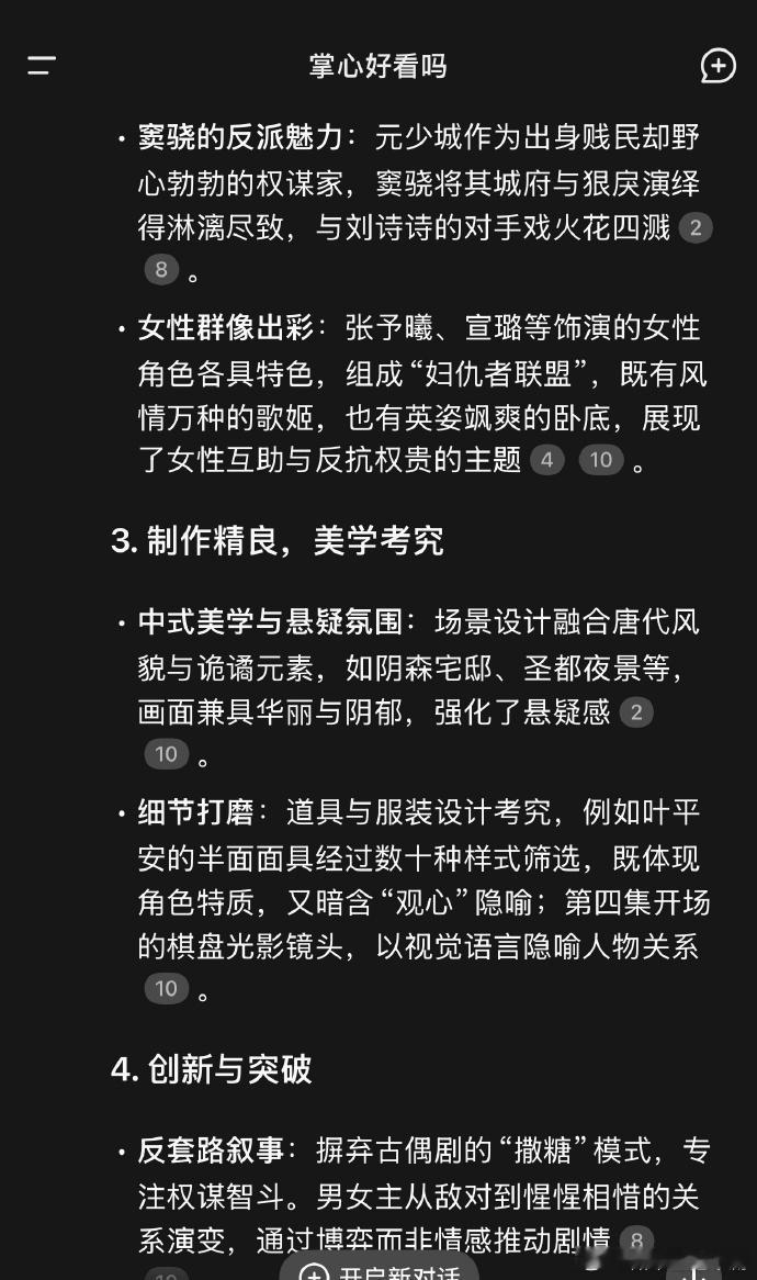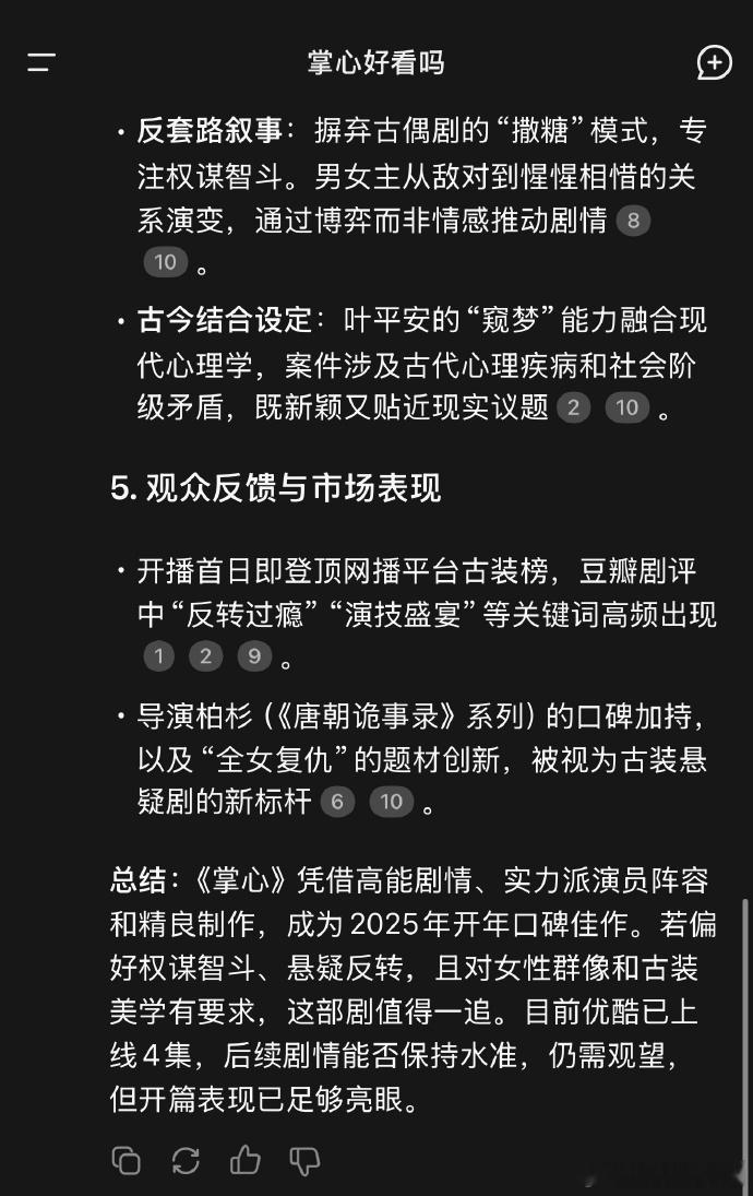 我问deepseek掌心好看吗 朋友按头安利的《掌心》真不骗人!权谋线埋得深但逻辑在线,女性角色不是工具人,每个都有自己的谋略,这剧根本猜不到下一秒会发生啥!