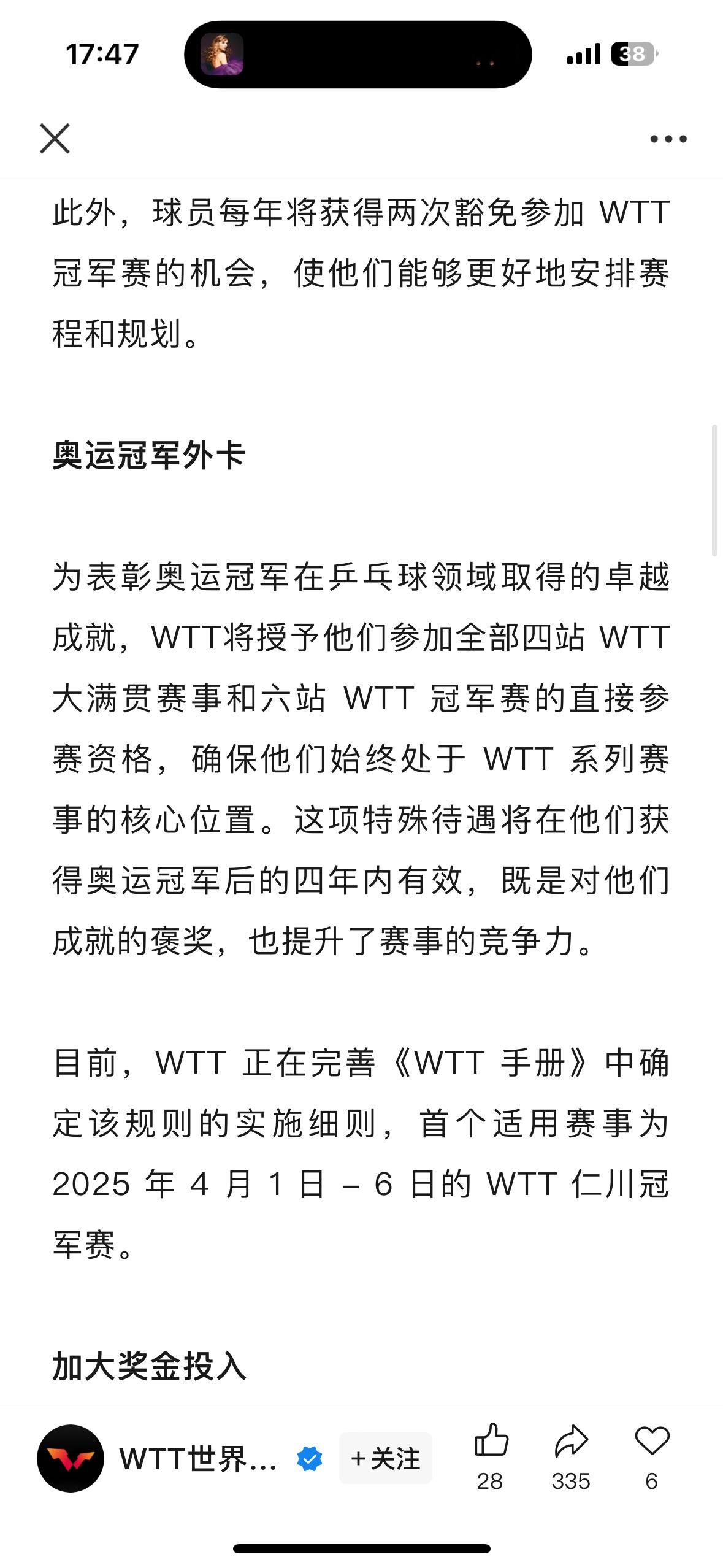 樊振东希望的是所有运动员都能公平公正的参赛。看了一下wtt的规则的变更,奥运冠军有更多特权反而压榨了普通球员,这和樊振东的初心并不一致,wtt只是为了让樊振东还有为不公平规则发声的球员闭嘴罢了。