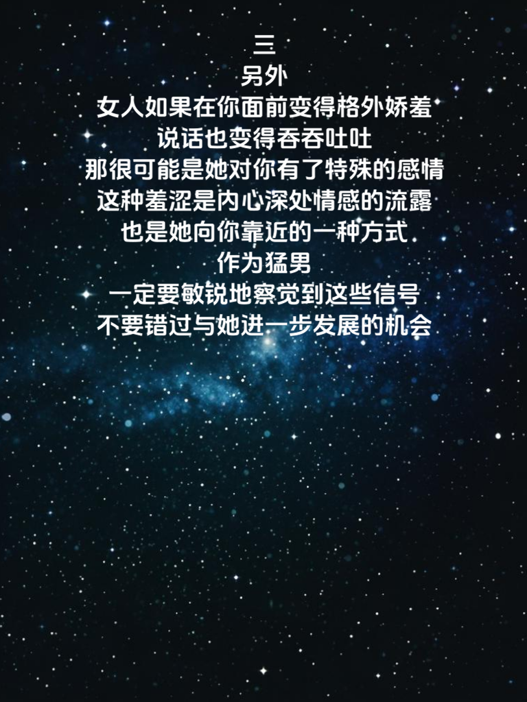 一、女人的一些不轨信号,往往容易被忽视。比如她突然开始频繁地与你接触,无论是工作上还是生活中,都找各种理由与你相处。这可能意味着她对你有了别样的情感。 二、还有,当她开始在意你的一举一动,你的每一个表情、每一句话都能牵动她的心绪,这也是一个重要的信号。她会不自觉地关注你,想了解你的生活细节,这往往是喜欢的表现。 三、另外,女人如果在你面前变得格外娇羞,说话也变得吞吞吐吐,那很可能是她对你有了特殊的感情。这种羞涩是内心深处情感的流露,也是她向你靠近的一种方式。作为猛男,一定要敏锐地察觉到这些信号,不要错过与她进一步发展的机会。