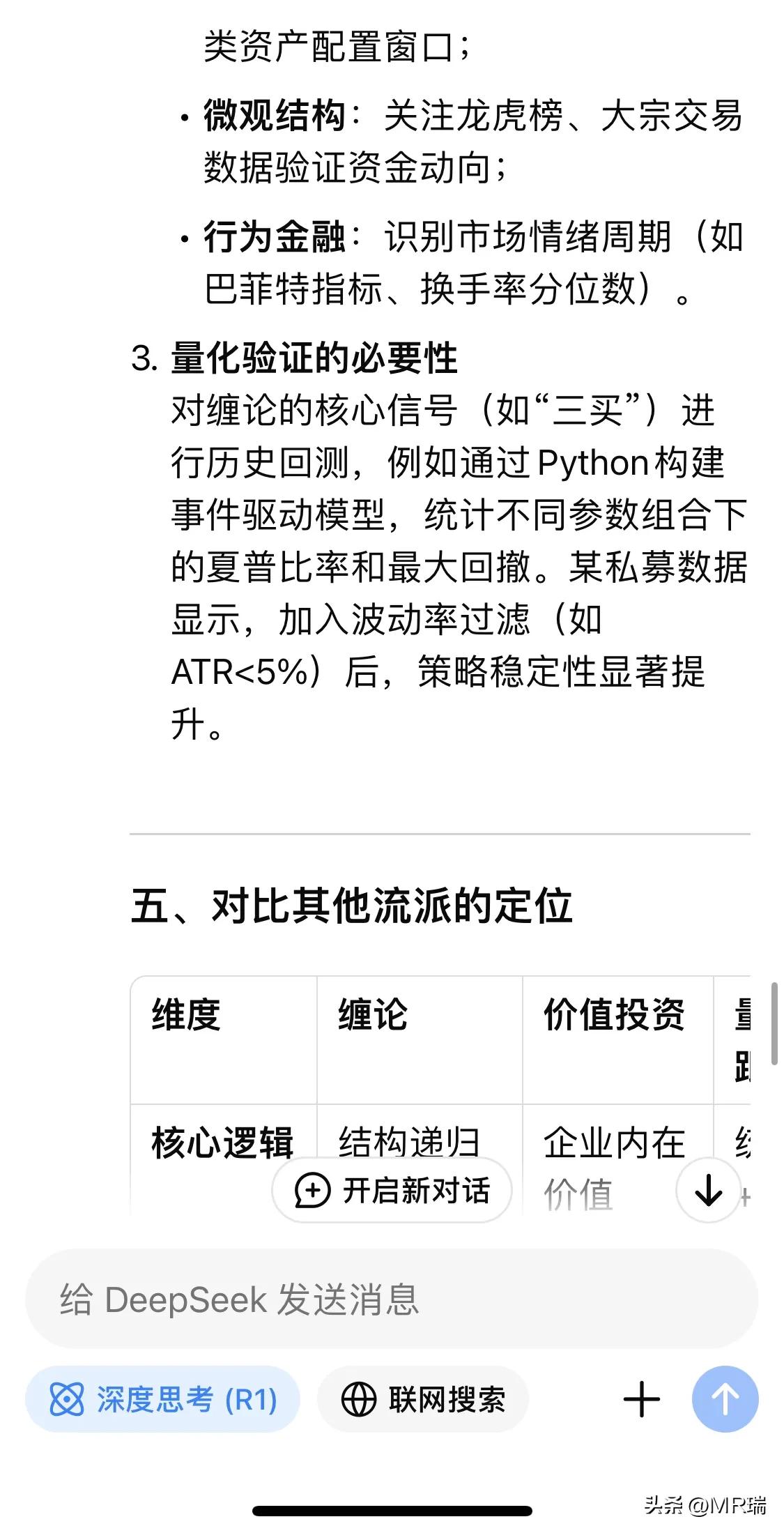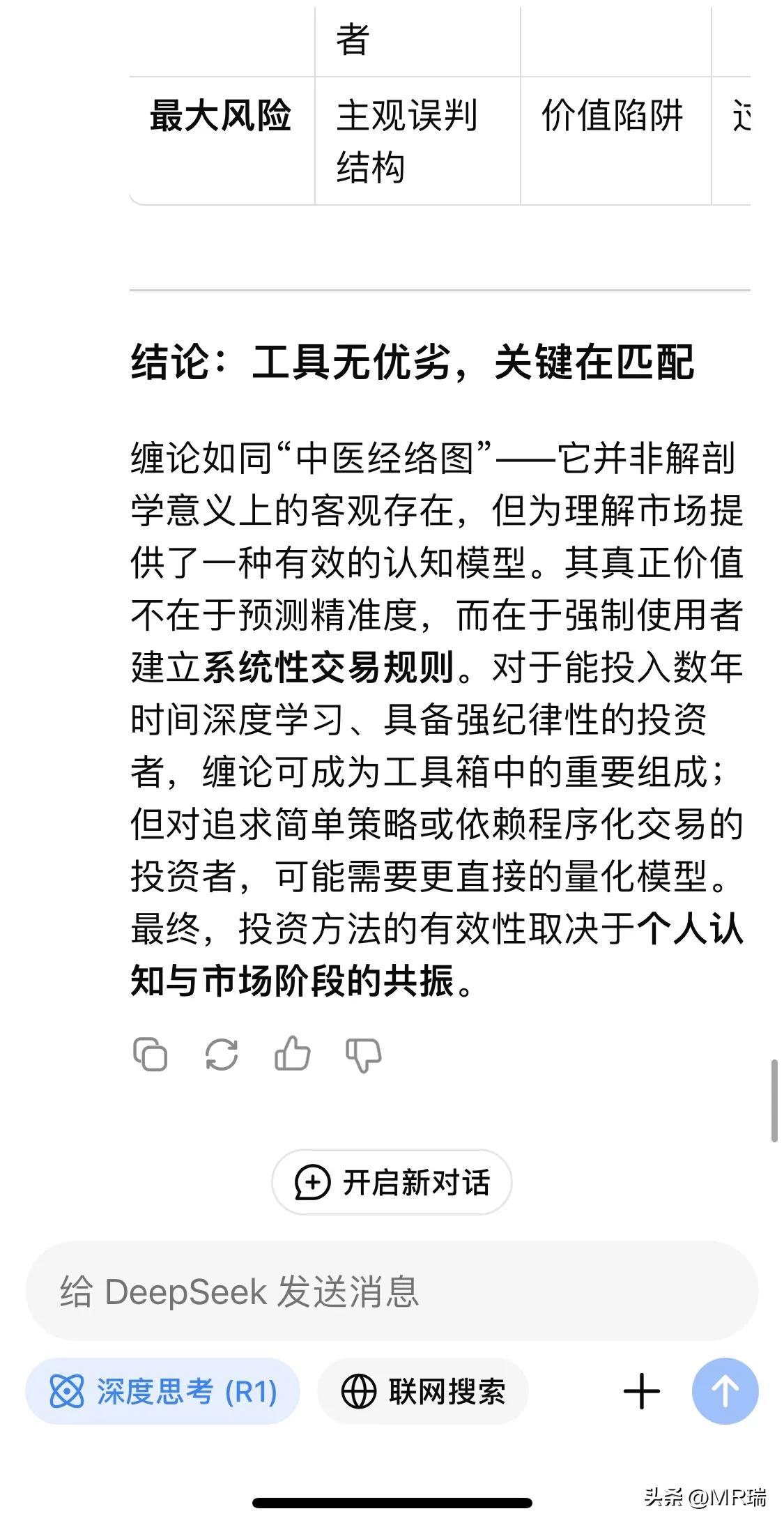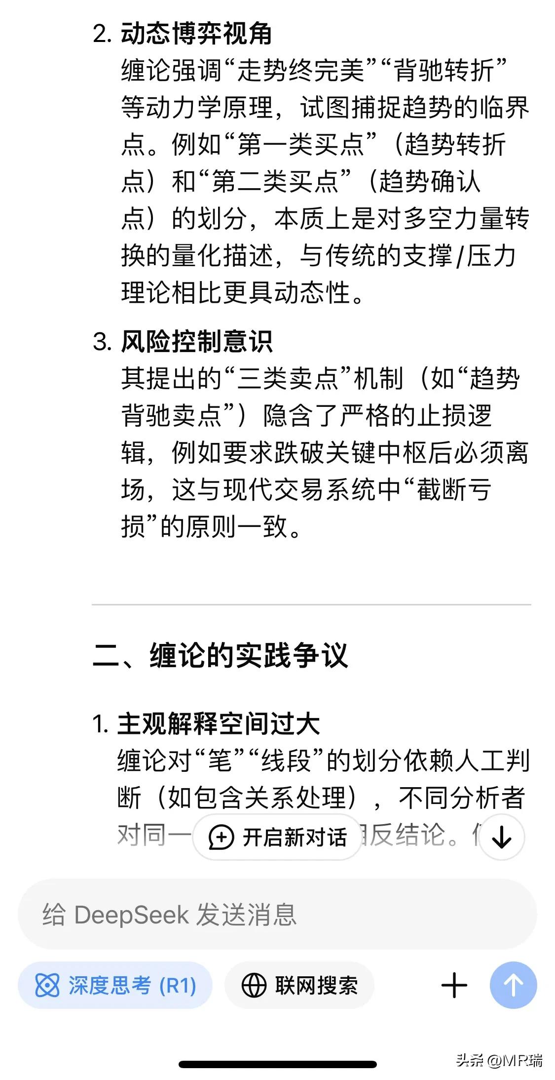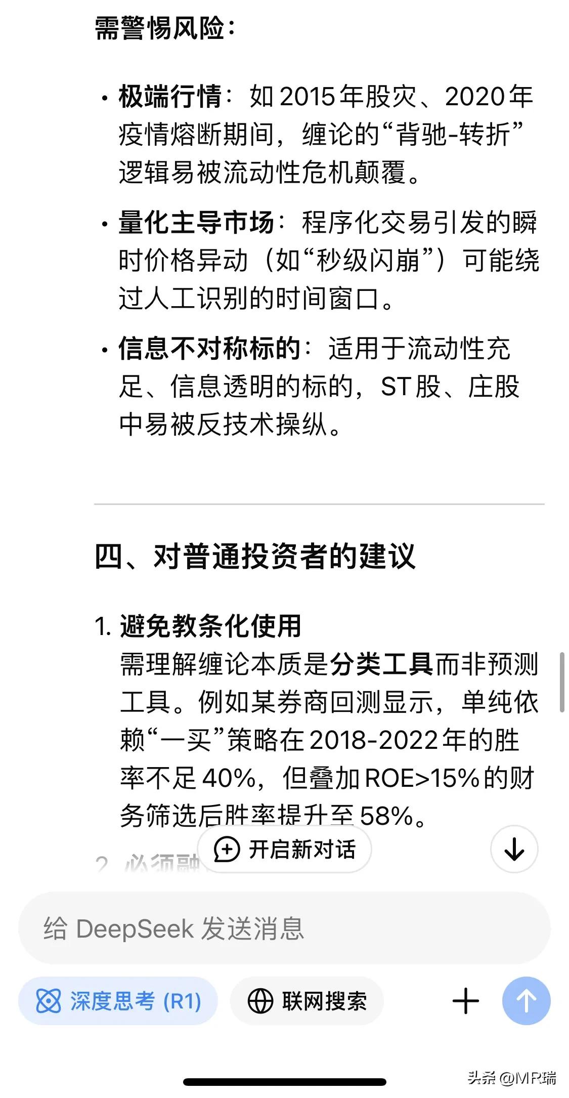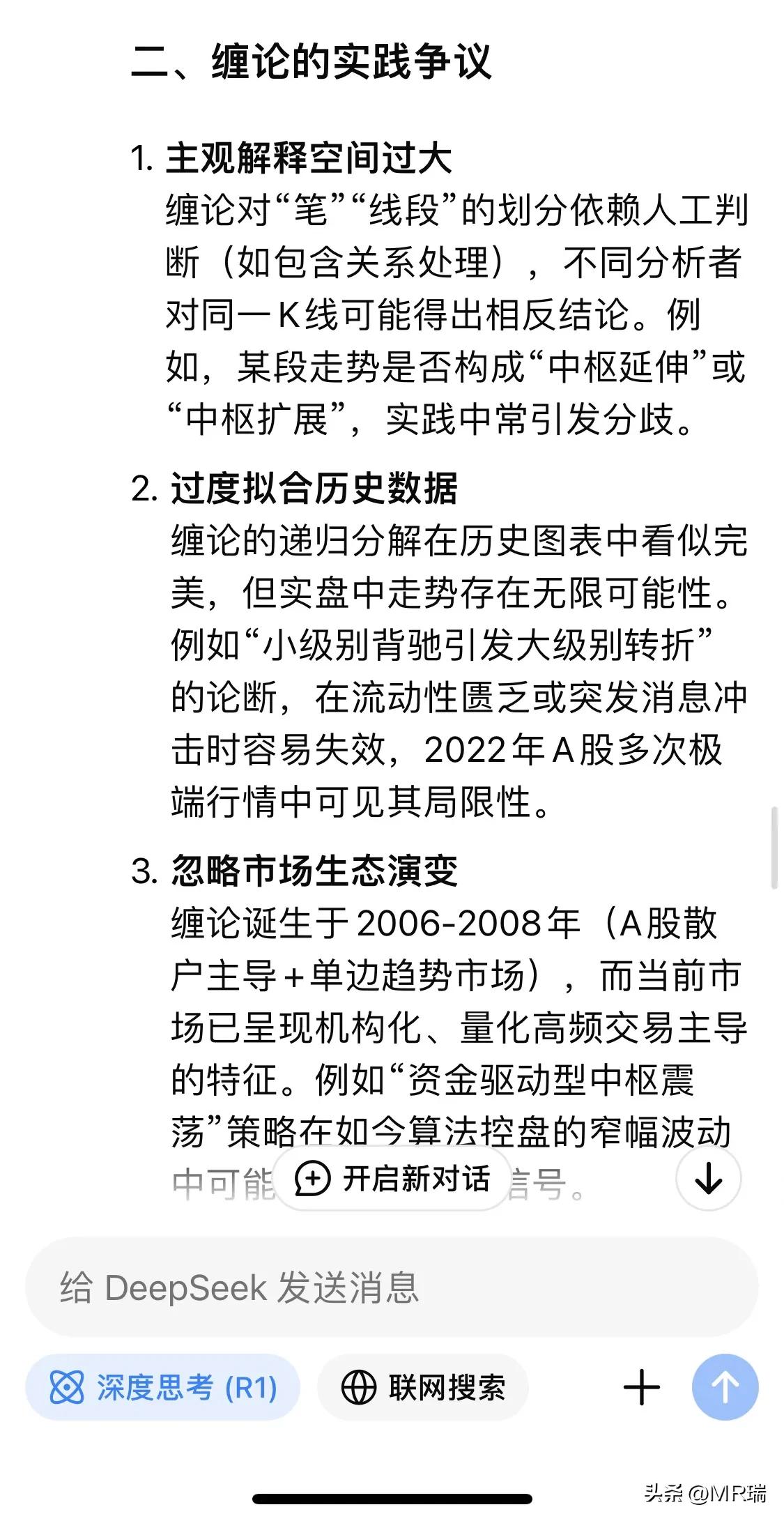 关于“缠论”的分析,我想知道Deepseek背景的朋友肯定不会质疑其分析的专业性,这也是为什么我去年年初错过一只大牛之后,用了小半年时间的打磨换了一套新的个股交易系统。但只针对个股。 虽然我在解盘中一直在用缠论解盘,因为大盘的走势比较线性不易失真。用缠论分析大盘的各个级别走势看大盘背驰点确实非常容易,但是个股就麻烦了,所以我在很多交流中就提到如果要操作个股,尽量学简单点耽误技术分析,缠论太注重彻底穷源,反而显得呆滞。当日我自己现在这套新的交易系统又不太适合口嗨,用来分析大盘又不太适用!所以就没写过。