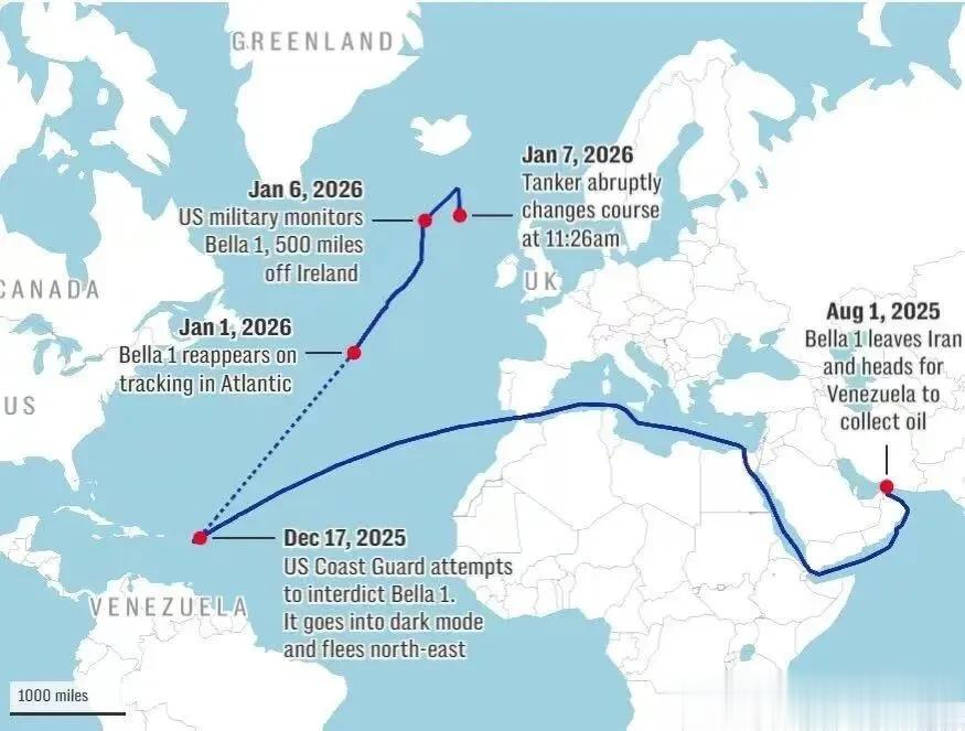 2026年1月6日,美国军方通报,“贝拉1号”已出现在距冰岛1500英里外的北大西洋公海。