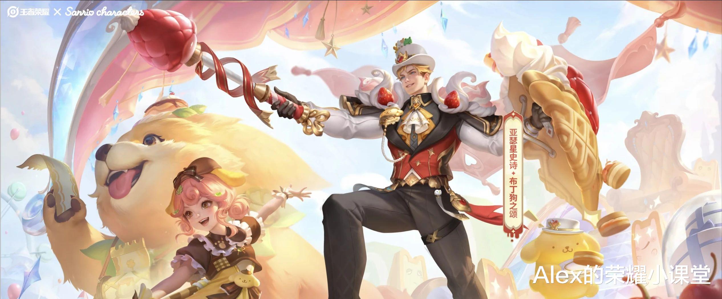 亚瑟身穿执事西服套装搭配礼帽,技能特效在延续布丁狗小剧场的主题上,融入了草莓奶油布丁元素。