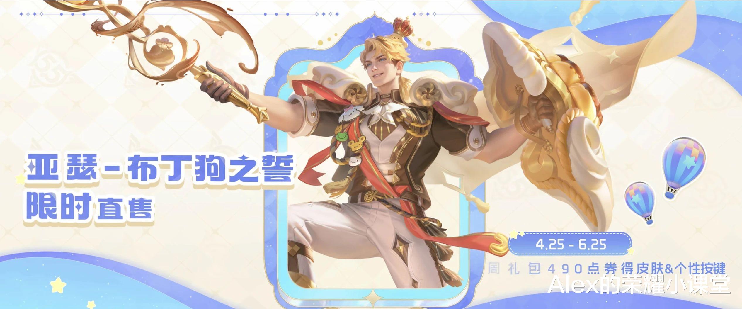 亚瑟-布丁狗之誓品质史诗限定,4月25日-6月25日限时上架,皮肤礼包首周490点券并赠送同款个性按键。