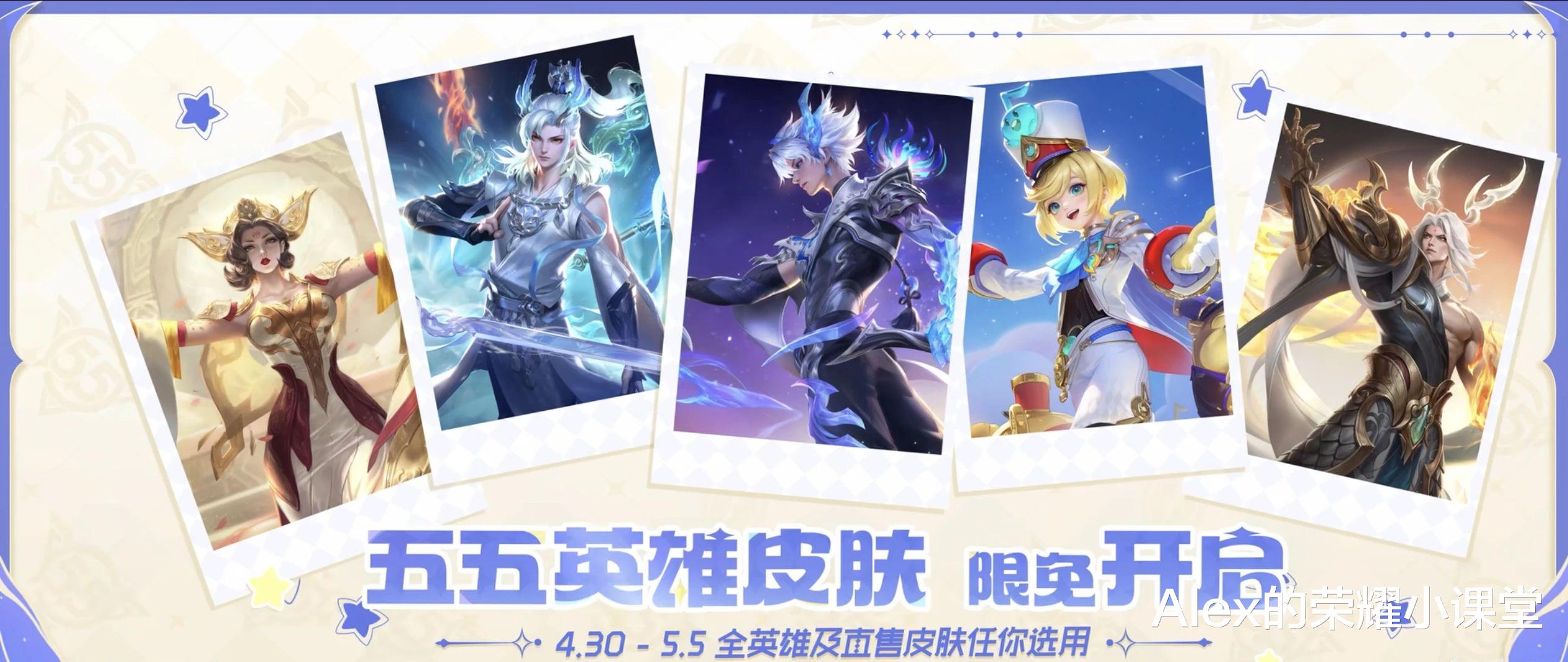 活动时间4月30日-5月5日,全英雄以及商城直售皮肤,全部限时免费使用。
