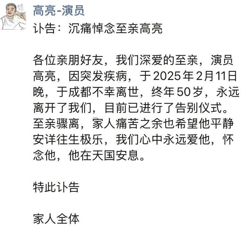 男演员高亮去世享年50岁。 看完他演的《驻站》,非常棒的演员,太可惜了,人生无常,祝一路走好! 看驻站,印象深刻的所长,才五十岁,一路走好,但愿天堂没有病痛! 最难受的是高明老爷子,白发人送黑发人!还望高明老爷子保重自己。 白发人送黑发人,太让人心疼!
