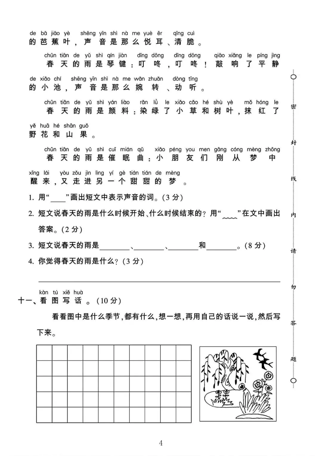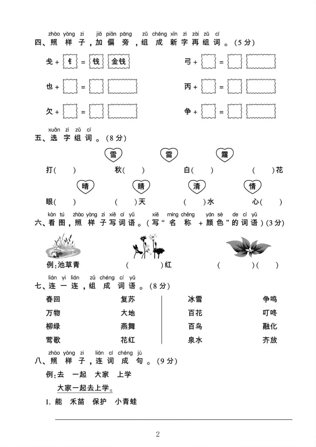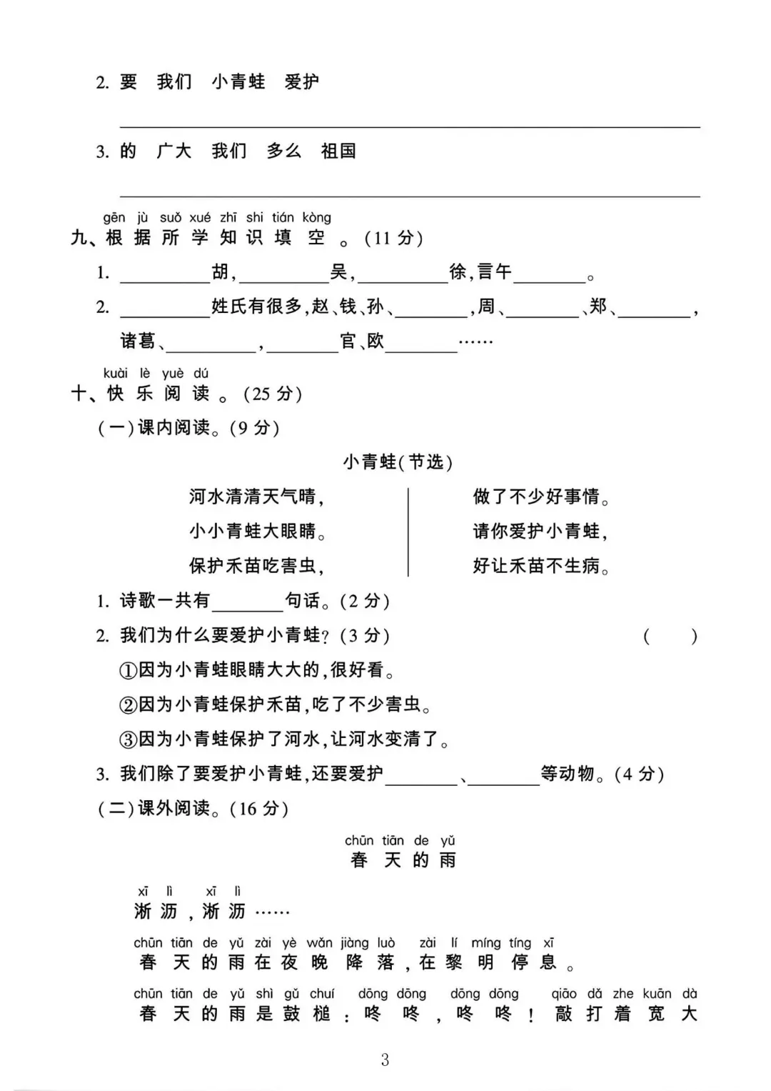 人教版 一年级语文下册 第一单元 单元测试 电子版可打印 一年级 🈶答案