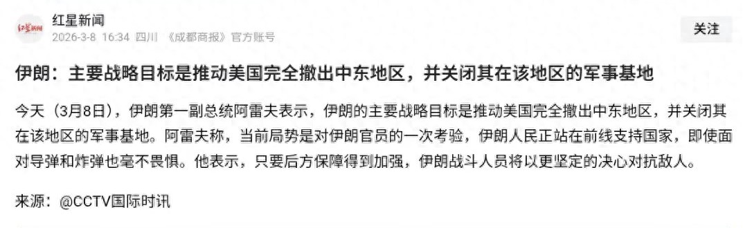 当地时间3月8日,伊朗官方终于给出了对战争的明确态度,直接以最清晰,最决绝的姿态向全世界摊牌:伊朗的核心战略目标是推动美国安全有序全面撤出中东地区,并关闭其在该地区的所有军事基地。