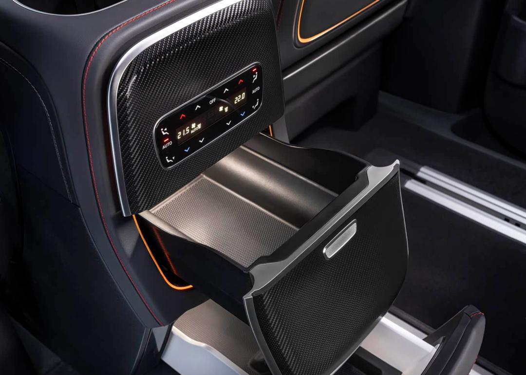 尤其是前排的氛围灯布置,橘红色的灯条在夜间点亮搭配类似碳纤维的饰板,让人感觉这不是一台MPV,倒像是一台AMG。