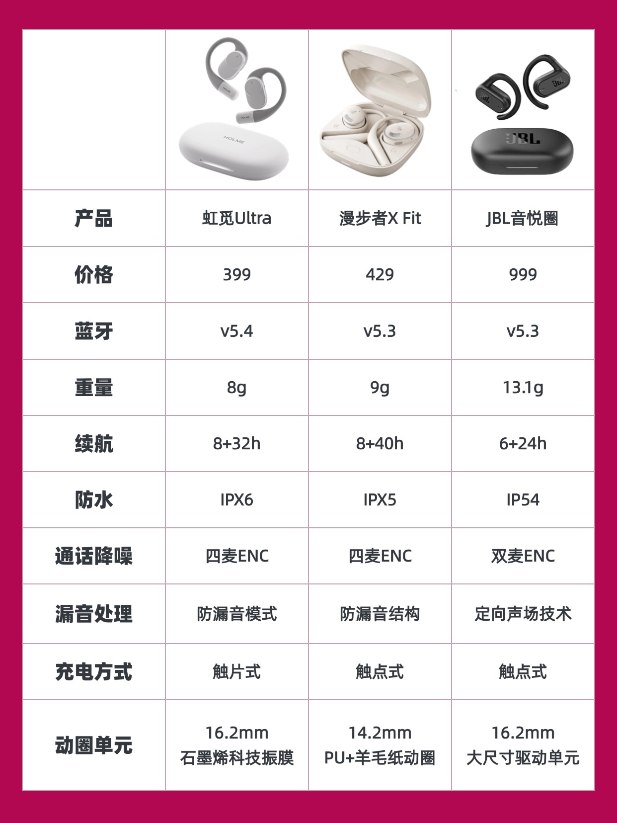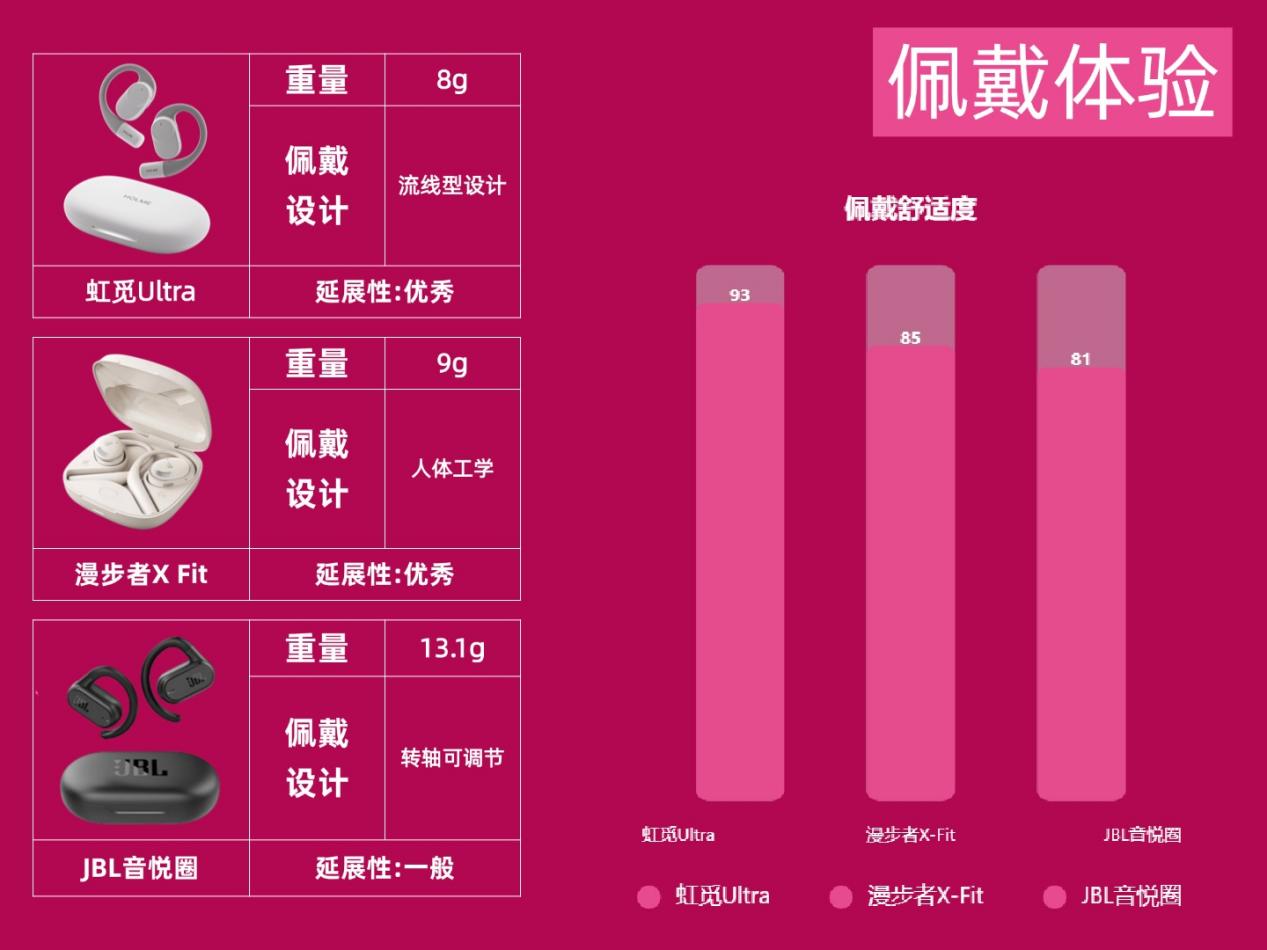 如今开放式耳机热度持续走高,凭借不堵塞耳道、久戴不闷、可清晰感知环境音的优势,在通勤、运动等场景下安全性更高,因此备受青睐。不过市面上相关产品繁多,品质差距较大,新手很容易盲目选购踩坑。为帮大家精准避坑、远离智商税,我专门挑选了三款热门机型,分别是虹觅Ultra、漫步者X-Fit、JBL音悦圈进行实测对比,给大家提供真实选购参考。