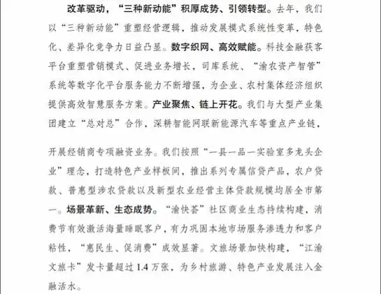 面对转型阵痛期的种种困难和挑战,渝农商行始终拥有清晰的战略方向。董事长刘小军在财报的致辞中指出,渝农商行把数字驱动、产业链动、场景圈动看作“三种新动能”。