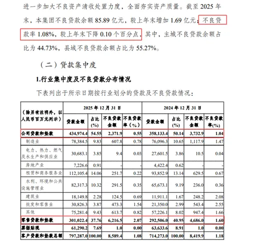 但从分业务上看,它对公贷款与零售贷款不良率呈现了两种不同发展趋势。2025年公司的贷款不良率为0.55%,仅同比下降了0.49个百分点,但个人零售端不良贷款率却有所上升,从2024年的1.60%升至2.07%。