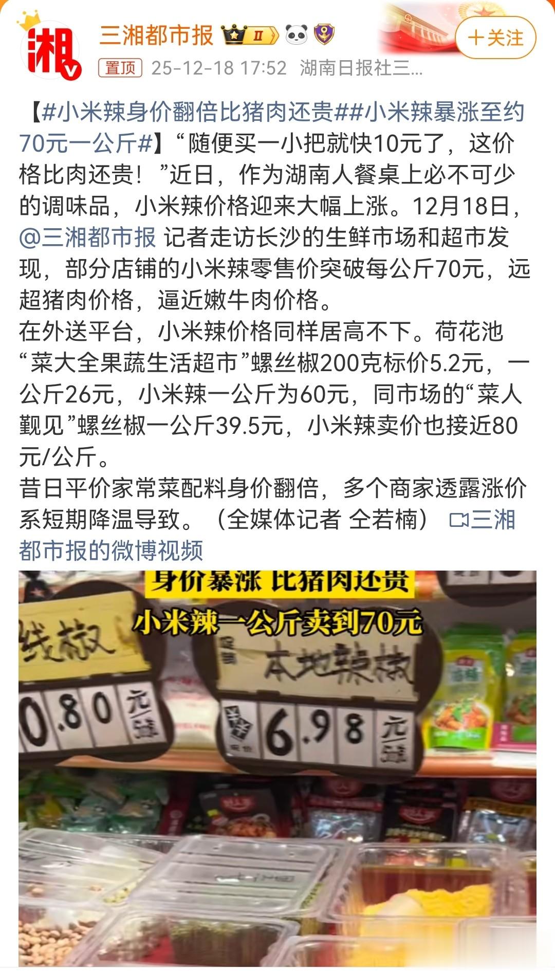 而近日有记者走访市场发现小米辣一公斤卖到70元,远超过猪肉的价格,价格更是逼近牛肉。