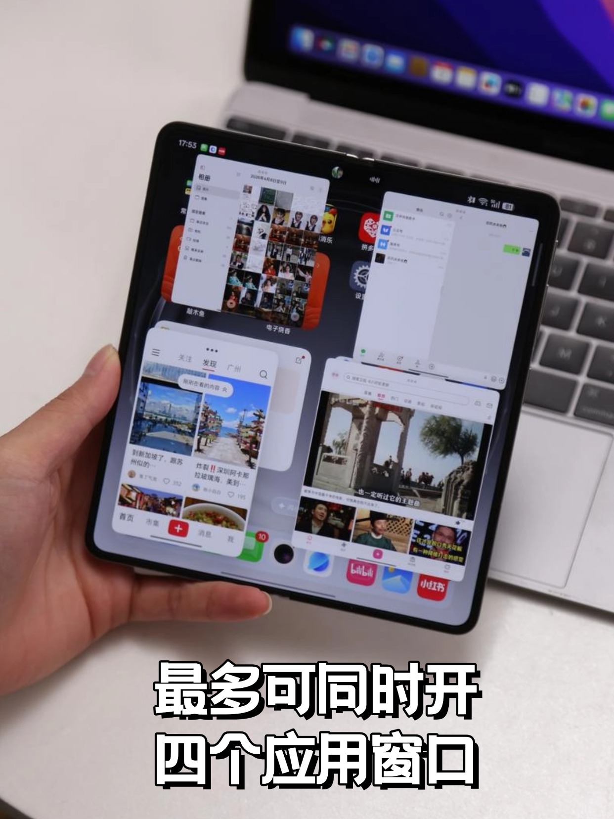除了生态交互无可挑剔,OPPO Find N6自身对于大屏体验的开发也非常到位,能同时开四个应用窗口,手势操作直觉又流畅。