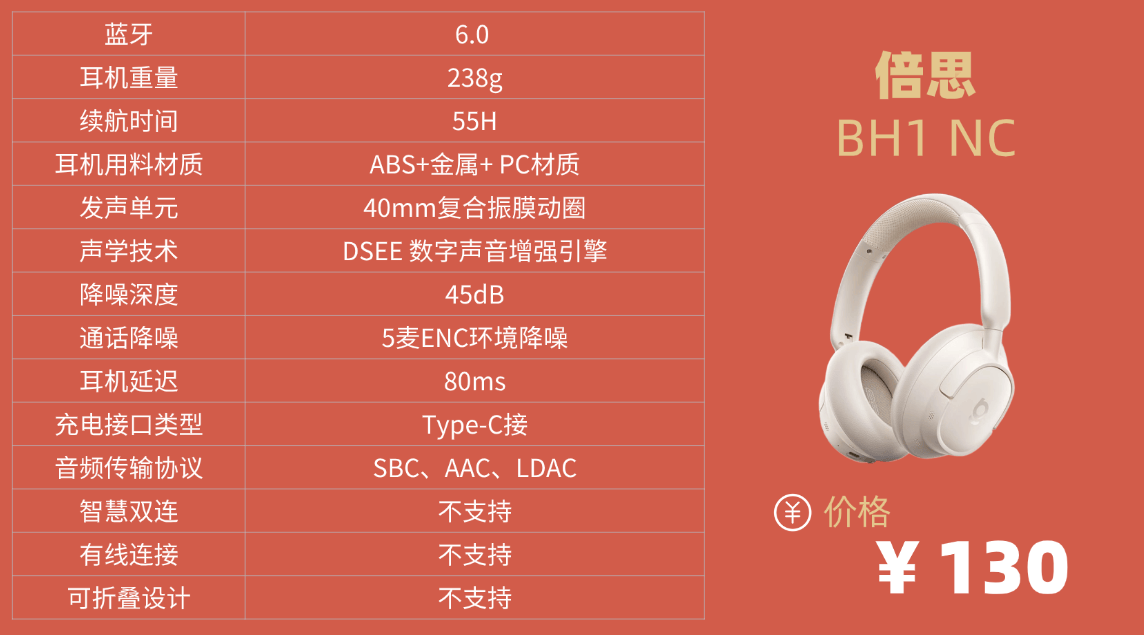 优势①耳机采用混合主动降噪技术,实测降噪深度可以达到-45dB,能有效过滤地铁、飞机等低频噪音,在通勤或办公场景下能明显感受到环境安静许多。配合通透模式,可在不摘耳机的情况下听到外界声音。佩戴方面,238g的重量控制得当,头梁柔韧、耳罩柔软,即使长时间佩戴也不会压头或夹耳;只是对于头型偏大的人,初戴时略有紧致感。蓝牙6.0连接稳定,支持 SBC、AAC、LDAC 编解码,兼容多设备并可双连接,切换顺畅。