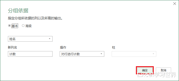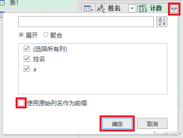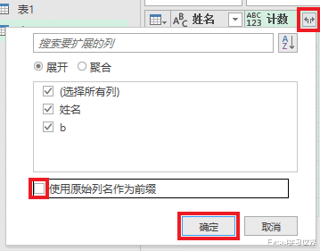 8. 展开“计数”列 --> 取消勾选“使用原始列名作为前缀”--> 点击“确定”