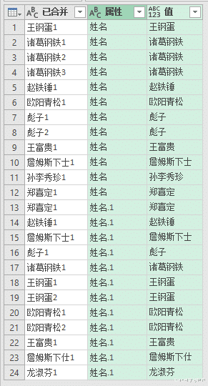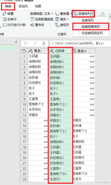 14. 选中“已合并”列 --> 选择任务栏的“转换”-->“逆透视列”-->“逆透视其他列”