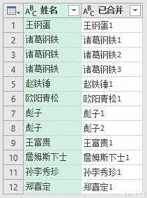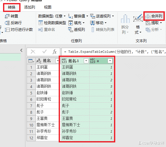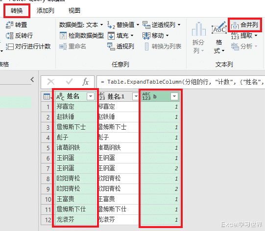 9. 选中“姓名”和 b 列 --> 选择任务栏的“转换”-->“合并列”