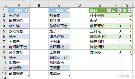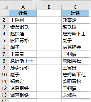 案例:比较下图 1 中两列人名的差异,效果如下图 2 所示。
