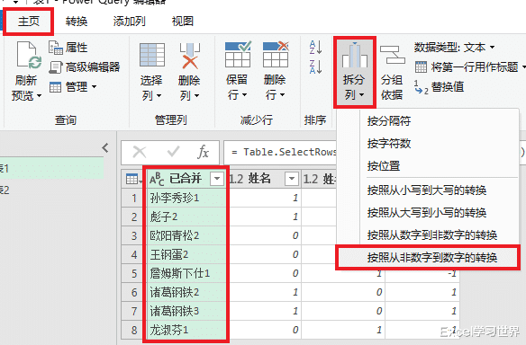 19. 将“已合并”列“按照从非数字到数字的转换”拆分开。