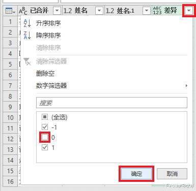 18. 展开“差异”列 --> 取消勾选 0 --> 点击“确定”