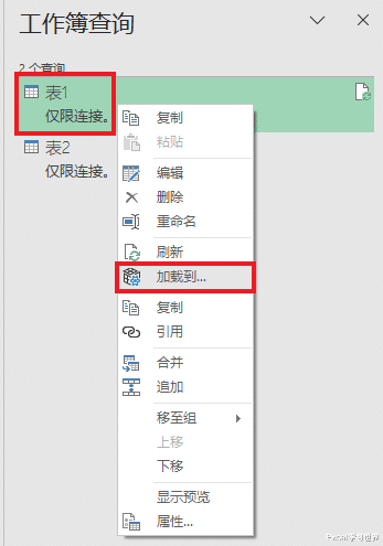 10. 选中“查询”区域中的“表1”--> 重复上述步骤 5 至 9。